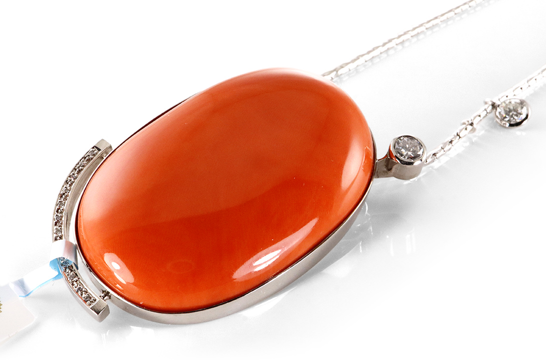 Umrahmt wird die Koralle von 14 funkelnden Diamanten mit einem Gesamtgewicht von rund 0,81 ct, in den erlesenen Farbstufen River bis Top Wesselton und Reinheiten von VVS bis SI2. Diese Brillanten betonen den edlen Charakter des Schmuckstücks und verleihen ihm eine strahlende Brillanz. Der Anhänger misst etwa 31,2 mm in der Breite, 44,8 mm in der Länge und 12,2 mm in der Stärke. Die Kette mit einer Stärke von ca. 1,7 mm kann auch separat getragen werden und ist wahlweise 46 cm oder 60 cm lang, versehen mit einem sicheren Federringverschluss.