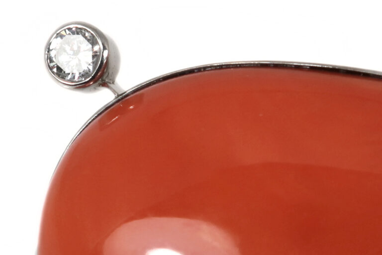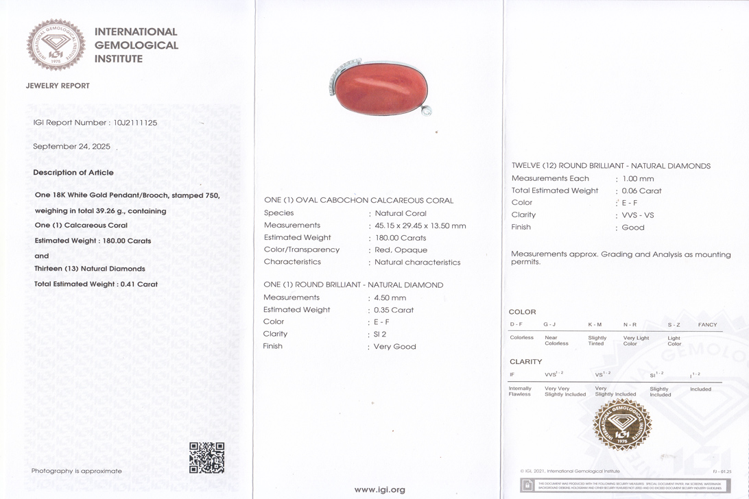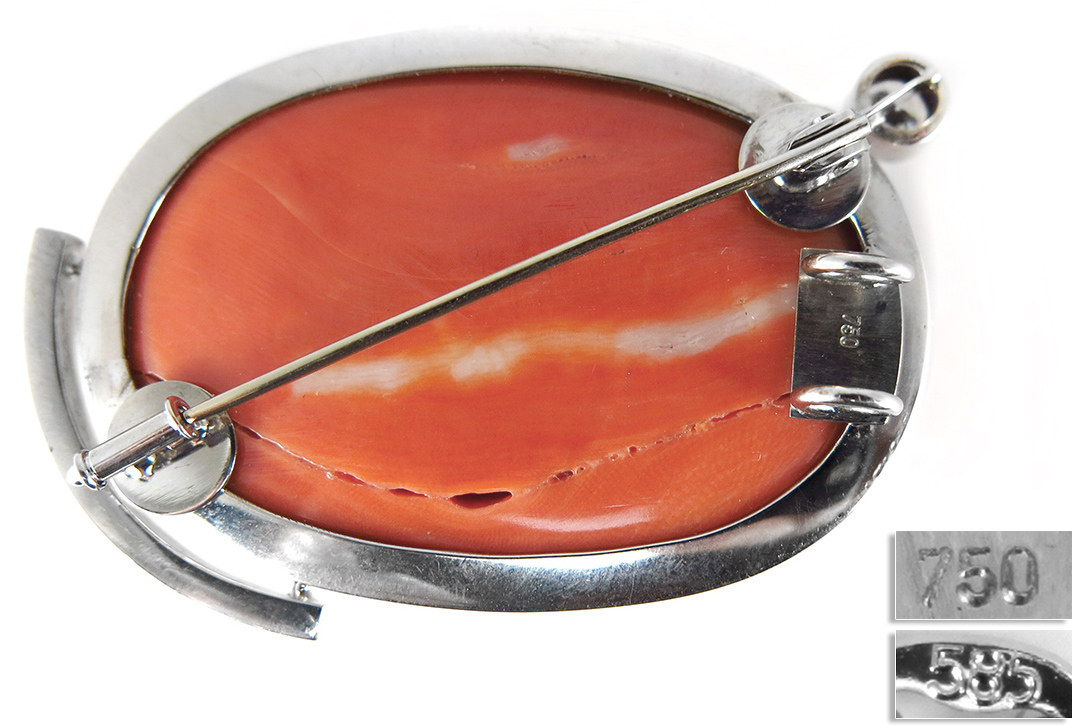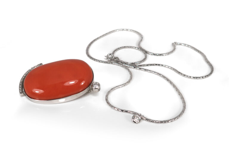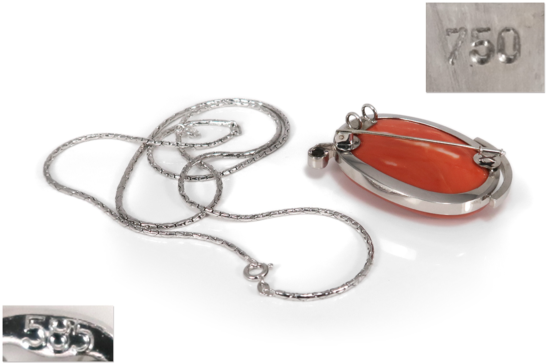 Dieser außergewöhnliche Anhänger mit Kette, der zugleich als elegante Brosche getragen werden kann, besticht durch seine kunstvolle Handarbeit und die harmonische Verbindung edler Materialien. Gefertigt aus 750er Weißgold für den Anhänger und 585er Weißgold für die Kette, zeigt dieses Schmuckstück eine meisterhafte Balance zwischen klassischem Design und luxuriöser Ausstrahlung. Mittelpunkt des Ensembles ist eine beeindruckende, ovale Koralle von etwa 45,1 mm × 29,4 mm × 13,52 mm, die in sanftem Cabochon-Schliff poliert wurde. Ihre warme, natürliche Farbigkeit steht in faszinierendem Kontrast zum kühlen Glanz des Weißgoldes.