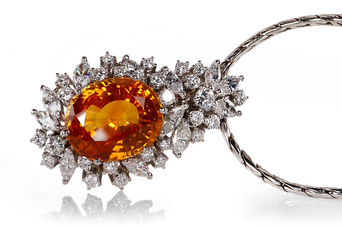 Diese exquisite Kette mit Anhänger aus edlem 750er Weißgold vereint außergewöhnliche Edelsteinkunst mit elegantem Design. Der Blickfang des Anhängers ist ein imposanter, natürlicher orangener Saphir von ca. 11,65 Karat. Seine tief orangefarbene Nuance und der facettierte Ovalschnitt verleihen ihm eine beeindruckende Strahlkraft, die in dieser Größe und Farbreinheit äußerst selten zu finden ist.