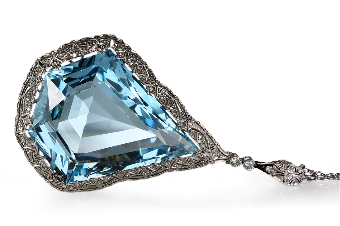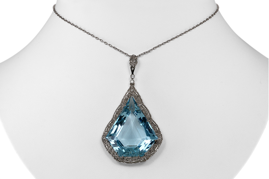Dieser Anhänger mit Kette beeindruckt durch seine außergewöhnliche Präsenz und eine Gestaltung, die den Geist des frühen 20. Jahrhunderts widerspiegelt. Im Zentrum steht ein eindrucksvoller Aquamarin mit einem Gewicht von ca. 64 ct., dessen tiefer, intensiver Blauton eine besondere Ruhe und Eleganz ausstrahlt. Der seltene Pentagon Mixed Cut verleiht dem Edelstein eine markante Form und unterstreicht seine Individualität, während die facettenreiche Ausarbeitung für ein faszinierendes Lichtspiel sorgt.