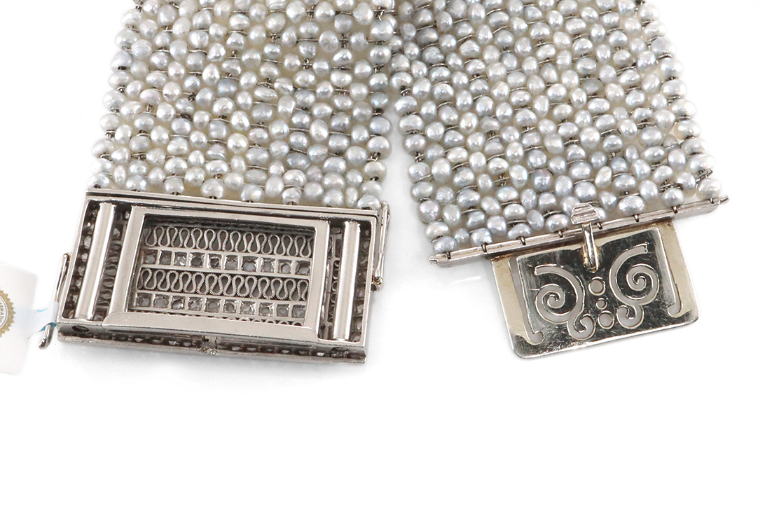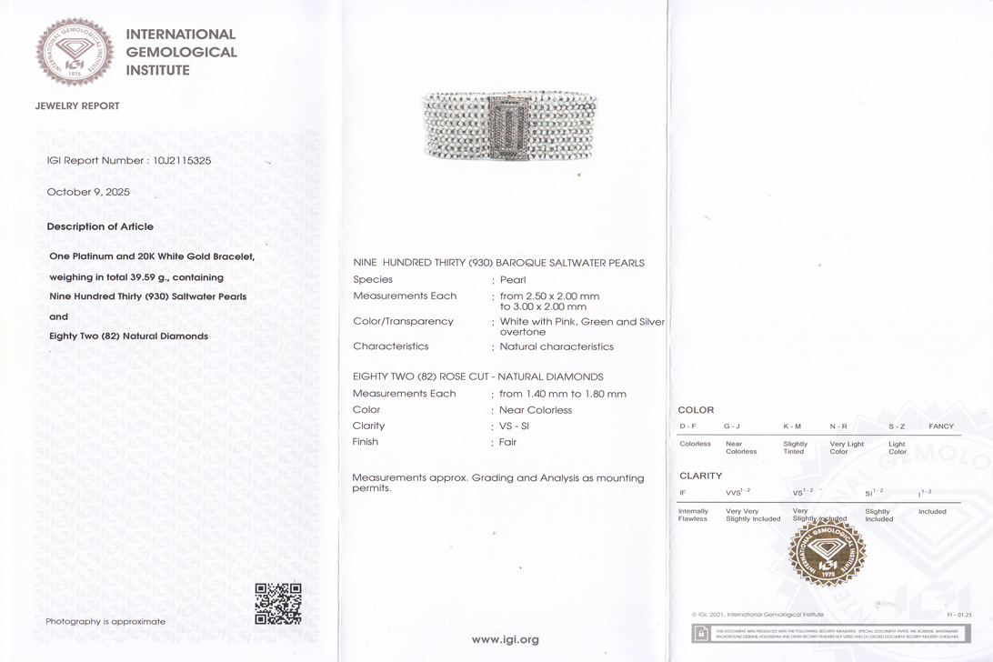 Dieses prachtvolle Perlenarmband vereint klassische Eleganz mit kunstvoller Handwerkskunst. Das Schmuckstück besteht aus edlem 930er Weißgold und Platin und beeindruckt durch seine außergewöhnliche Kombination aus feinen Salzwasserperlen und funkelnden Diamanten. Die 930 Perlen zeigen sich in einem zarten Weißton mit feinen Nuancen von Rosa, Grün und Silber. Ihr natürlich glänzender Lüster und die harmonisch runde Form verleihen dem Armband eine unvergleichliche Anmut und feminine Ausstrahlung.