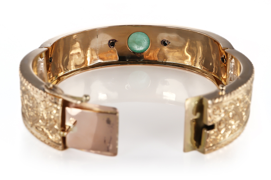 Im Mittelpunkt steht ein Smaragd von ca. 5,0 ct, der im runden Cabochonschliff gearbeitet ist. Seine transparente grüne Farbe wirkt ruhig und intensiv zugleich und setzt einen edlen Farbakzent. Umrahmt wird der Smaragd von 58 Diamantrosen in den Farbgraduierungen E–F und einer Reinheit von VS–SI. Ihr sanftes, historisch anmutendes Funkeln bildet einen reizvollen Kontrast zur glatten Oberfläche des Cabochonsteins. Ergänzt wird das Design durch blaue Emaille, die dem Armreif zusätzliche Tiefe und eine besondere dekorative Note verleiht.