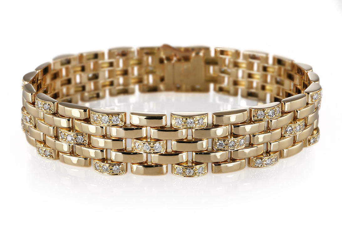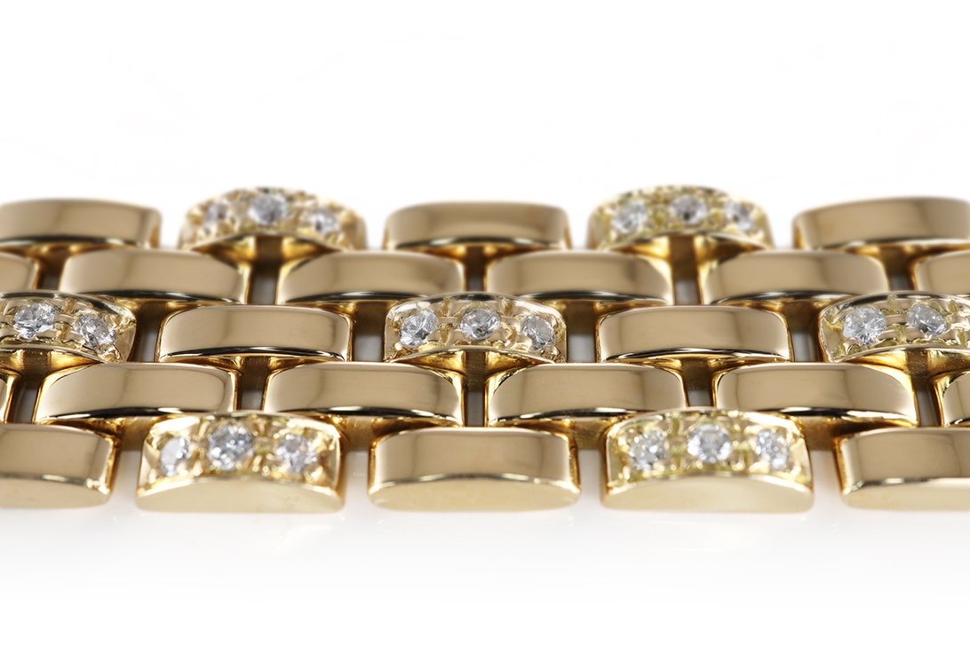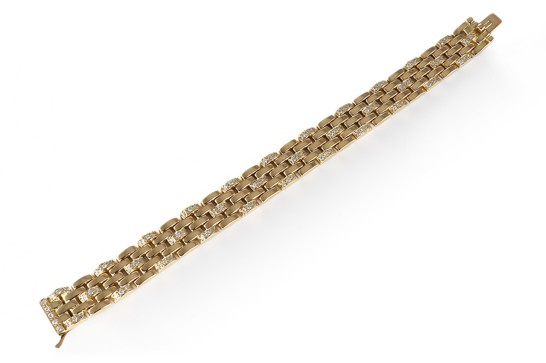 Besonders eindrucksvoll ist der hochwertige Diamantbesatz: Insgesamt 104 Brillanten mit einem Gesamtgewicht von ca. 2,0 Karat sind präzise gefasst und verleihen dem Armband ein lebendiges, gleichmäßiges Funkeln. Die Diamanten in Top-Wesselton-Farbe und VVS-Reinheit unterstreichen den exklusiven Charakter dieses Schmuckstücks und harmonieren perfekt mit dem warmen Ton des Gelbgoldes. Die brillante Ausarbeitung sorgt für ein dezentes, aber kontinuierliches Lichtspiel bei jeder Bewegung.