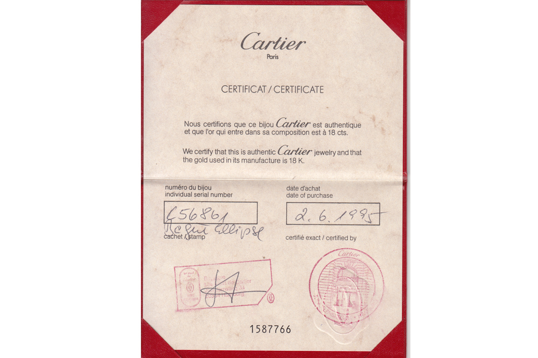 Geliefert wird dieses begehrte Vintage-Stück in der originalen Cartier-Box sowie mit den dazugehörigen Originalpapieren – ein eindrucksvolles Sammlerobjekt und stilvolles Schmuckstück zugleich.