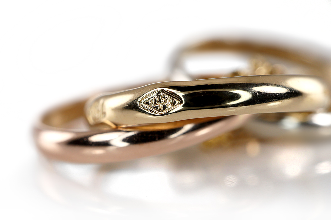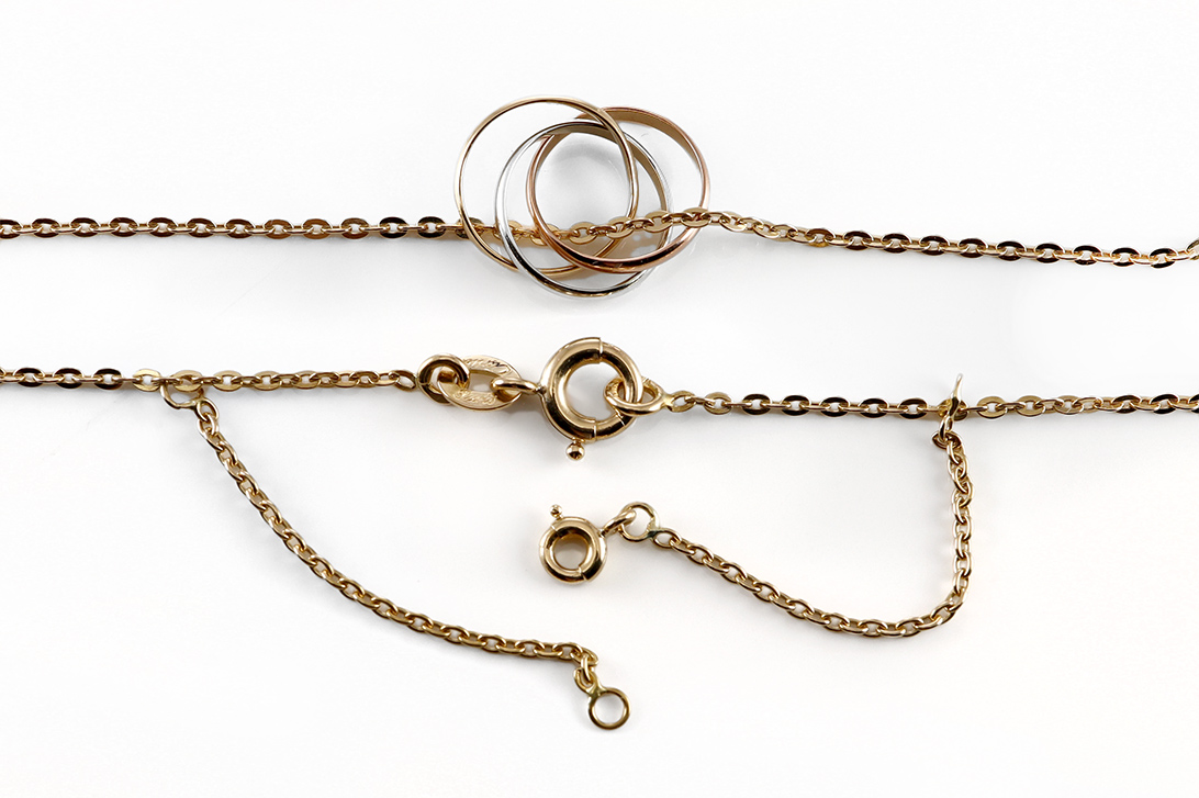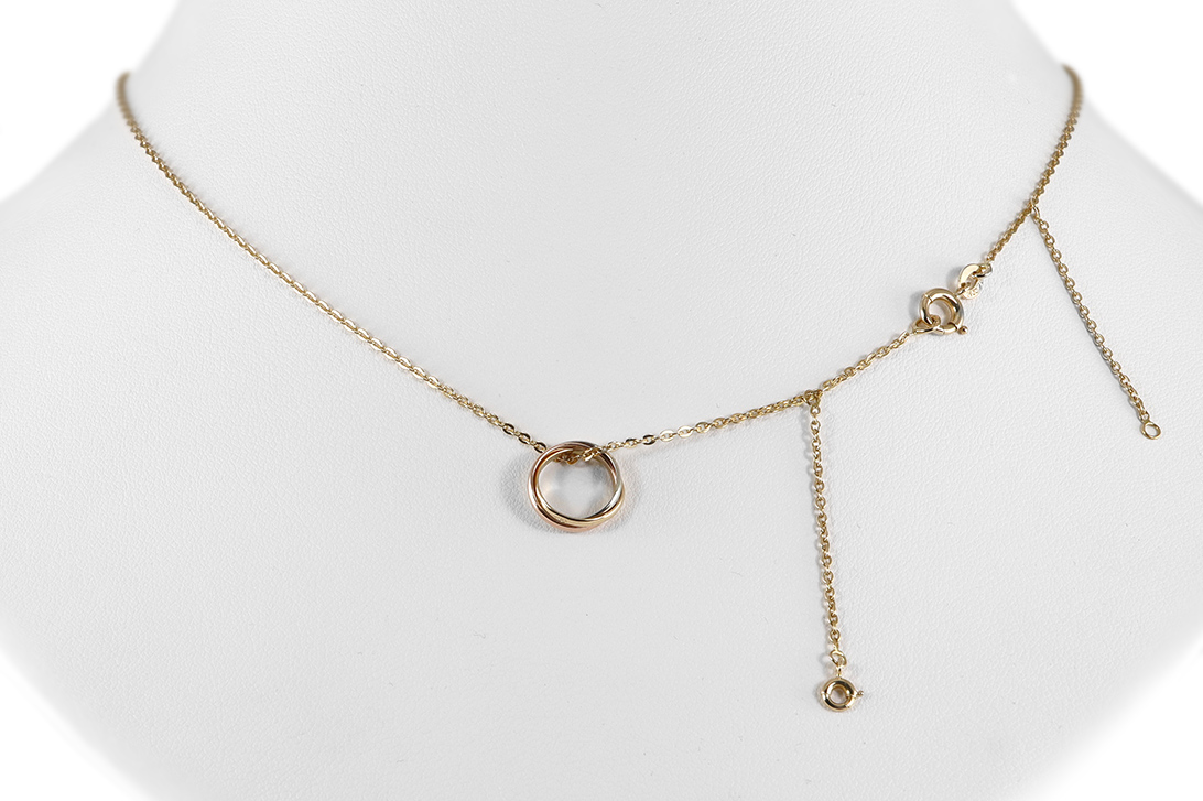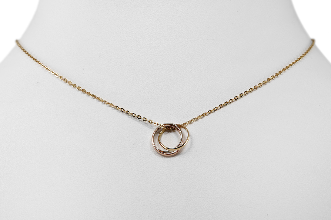 Die feinen, beweglichen Trinity-Ringe entfalten durch ihr Zusammenspiel der unterschiedlichen Goldtöne eine besondere Dynamik und Lebendigkeit. Jeder Ring steht für eine eigene Bedeutung und verleiht dem Schmuckstück eine zusätzliche emotionale Tiefe. Die filigrane Ausarbeitung und die ausgewogenen Proportionen sorgen für eine elegante Erscheinung, die sowohl dezent als auch ausdrucksstark wirkt.
