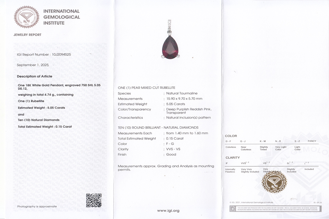 Geliefert wird dieses elegante Schmuckstück in einer repräsentativen Schmuckverpackung sowie mit dem abgebildeten IGI-Gutachten, das die hohe Qualität des Rubellits bestätigt.