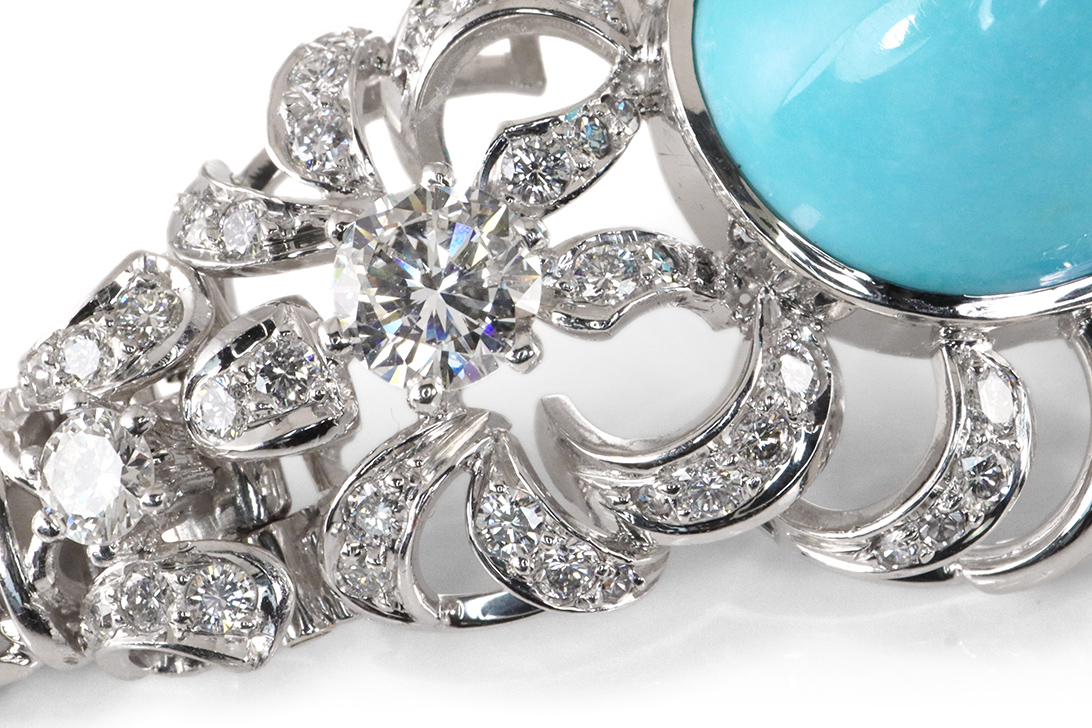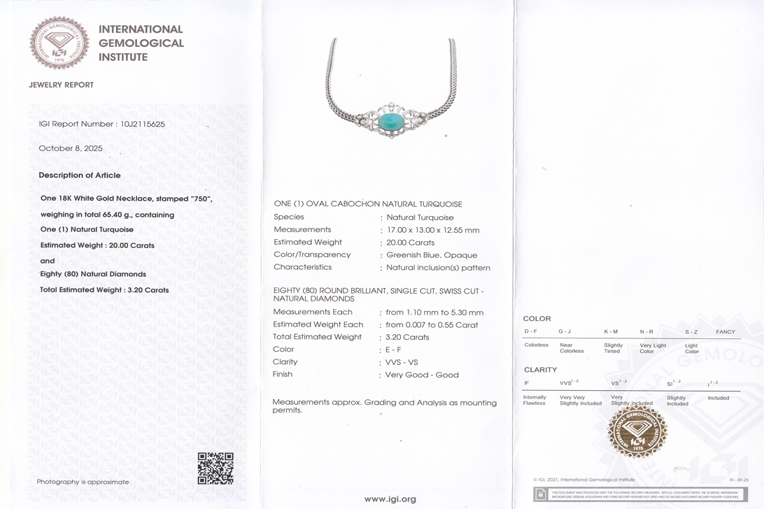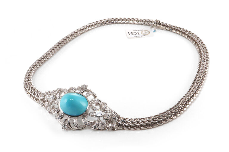 Rund um den zentralen Türkis entfalten insgesamt 80 feinste Diamanten mit einem Gesamtgewicht von ca. 3,20 Karat ihre strahlende Wirkung. Mit Farbtönen von E–F und Reinheiten zwischen VVS und VS zeigen sie höchste Brillanz und unterstreichen die kostbare Wirkung des Colliers. Ihre facettenreichen Schliffarten – Brillantschliff, Single Cut und Swiss Cut – sorgen für ein lebendiges Funkeln in jedem Licht.