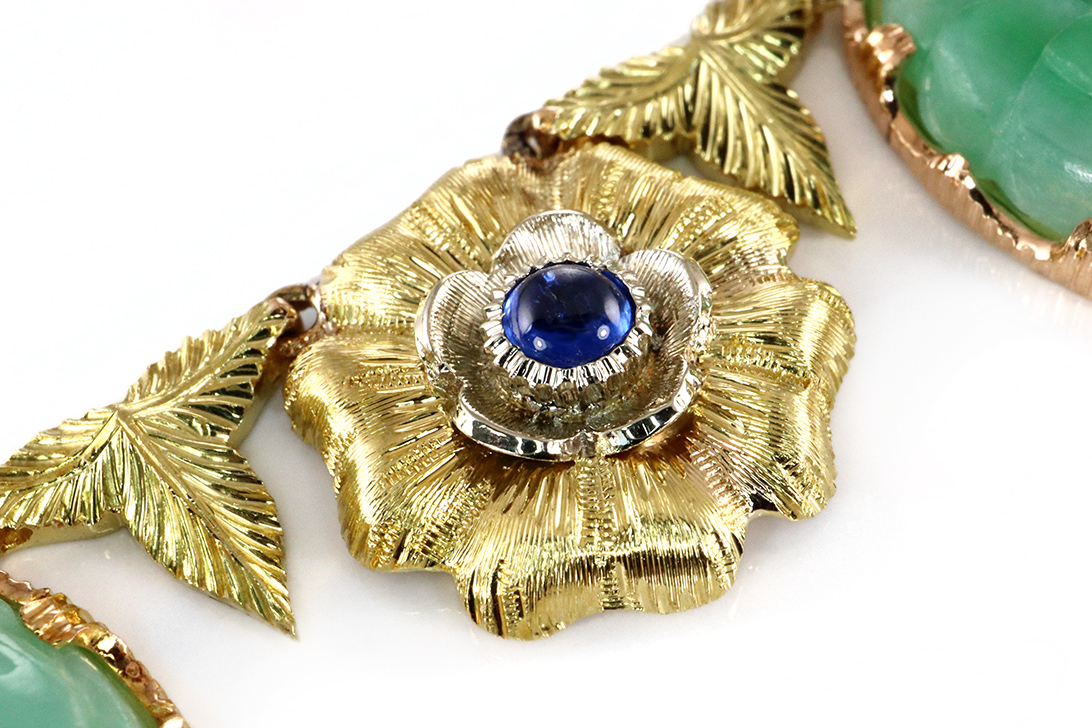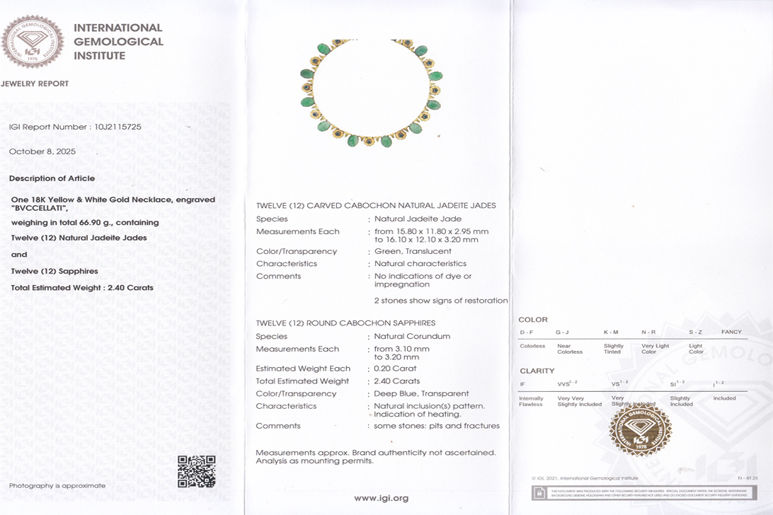 Zwölf leuchtend grüne Jadesteine bilden das Herzstück dieses außergewöhnlichen Schmuckstücks. Mit ihren natürlichen Maßen zwischen ca. 15,8 x 11,8 x 2,95 mm und 16,10 x 12,10 x 3,20 mm entfalten sie eine faszinierende Tiefe und Farbintensität. Ergänzt wird die Komposition durch zwölf tiefblaue Saphire im Cabochonschliff, die zusammen etwa 2,40 Karat wiegen. Ihr samtiger Glanz bildet einen reizvollen Kontrast zur kühlen Brillanz des Weißgoldes und dem warmen Schimmer des Gelbgoldes.