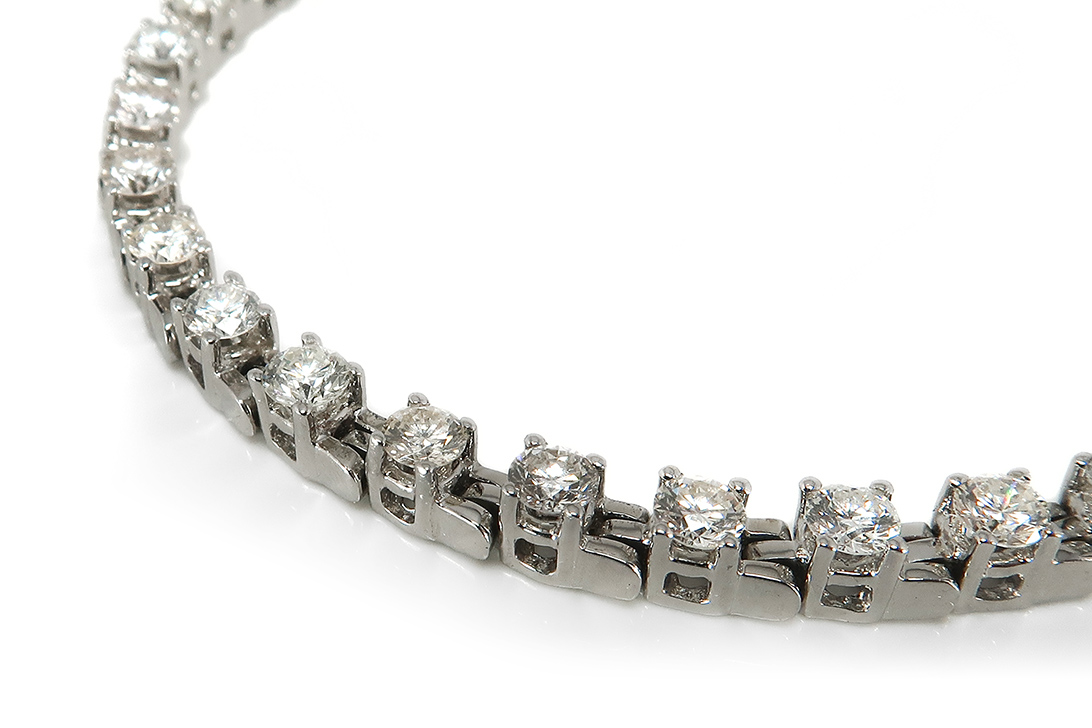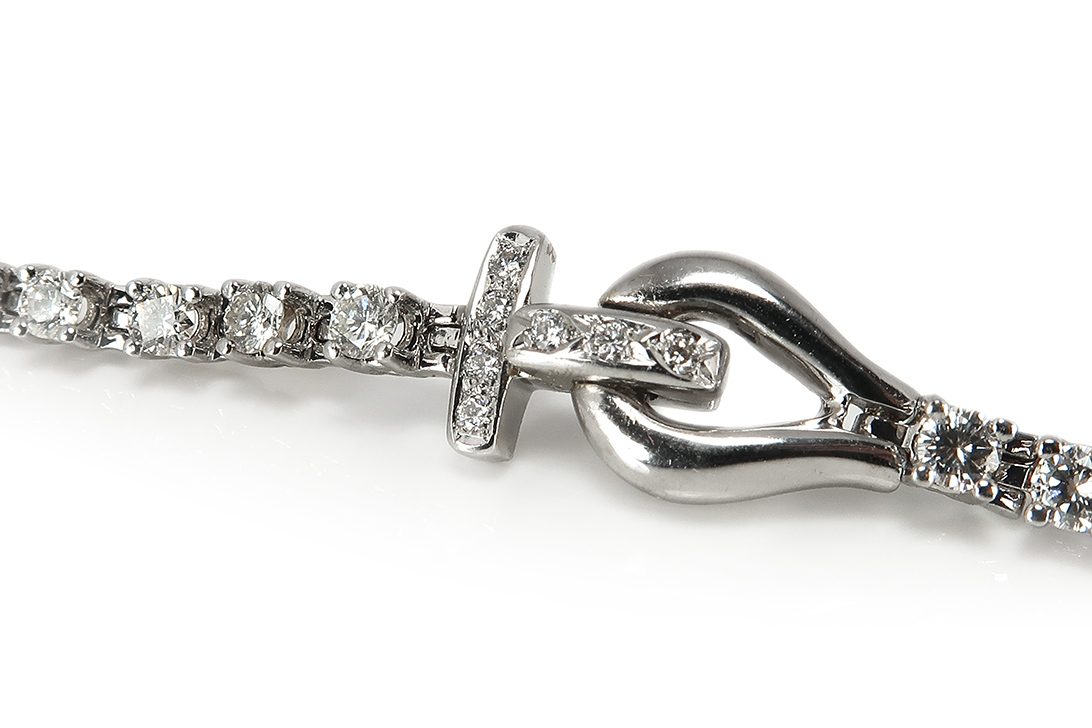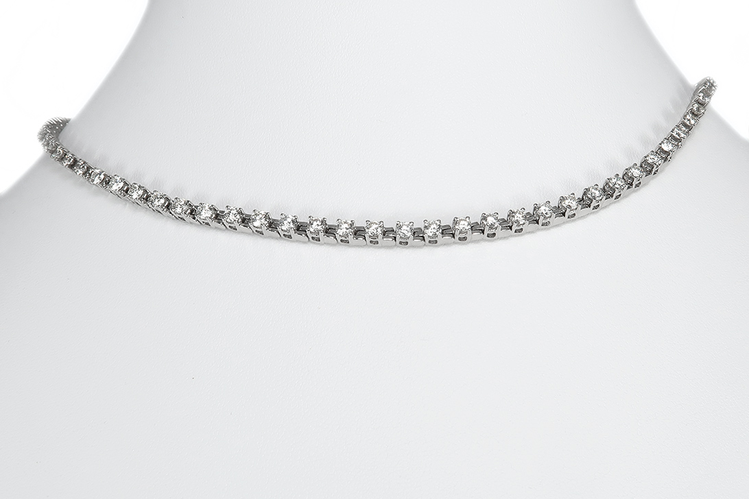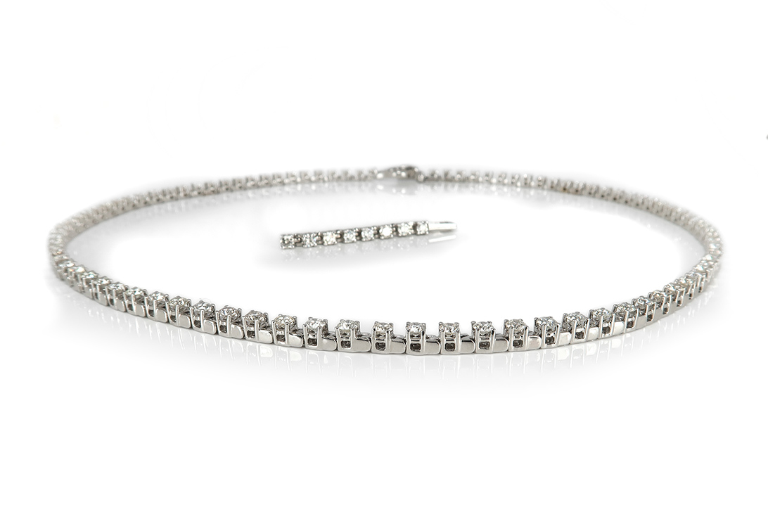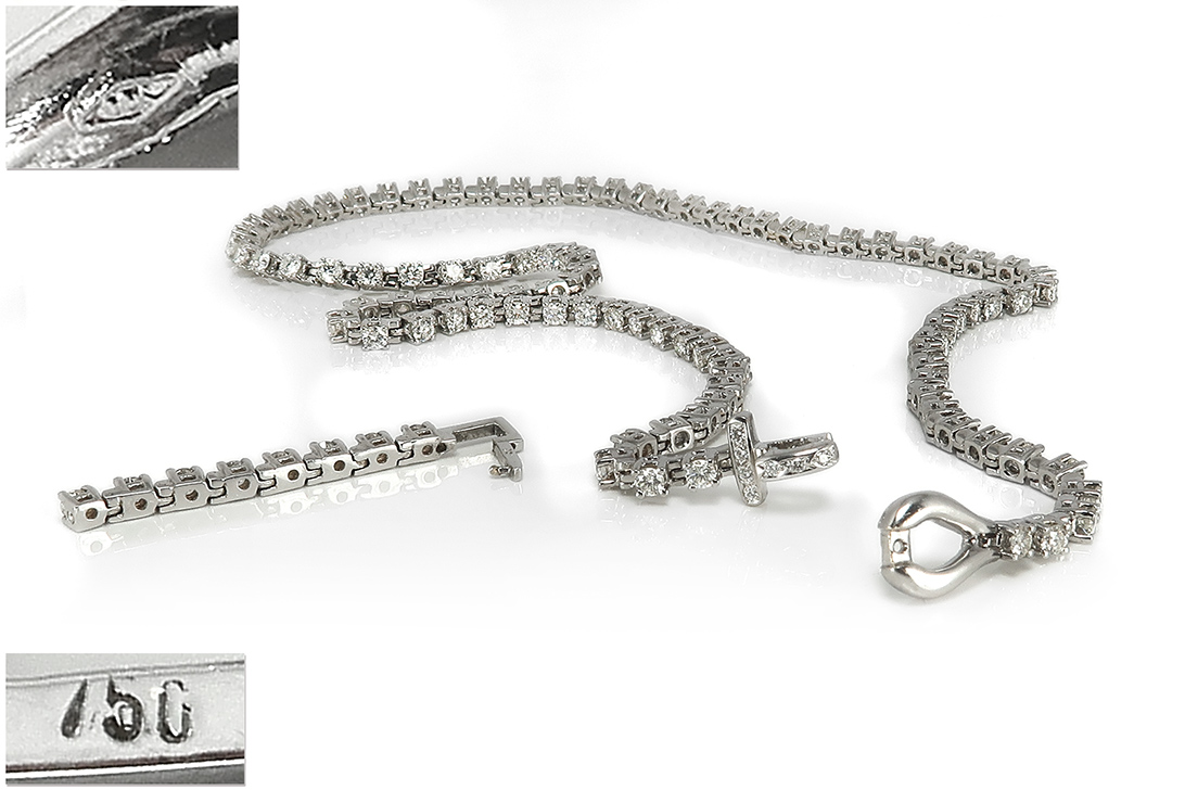 Die gesamte Kreation wird von 107 funkelnden Diamanten in Brillantschliff geziert, die zusammen ein beeindruckendes Gesamtgewicht von ca. 9,30 ct erreichen. Ihre feinen Farbabstufungen von G bis I und Reinheiten im Bereich VS bis SI lassen das Licht in vielfältigen Reflexen erstrahlen und erzeugen ein lebendiges, glanzvolles Funkeln. Mit einer Collierlänge von ca. 44,0 cm liegt das Schmuckstück elegant am Dekolleté an, während die Breite von etwa 3,3 mm für eine ausgewogene Proportion sorgt.
