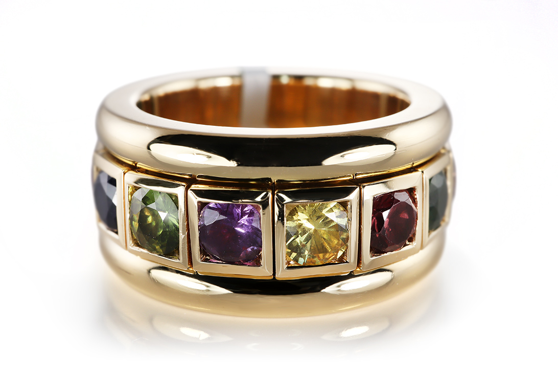Besonders hervorzuheben ist die bewegliche Mittelschiene, in die 15 erlesene Saphire mit insgesamt etwa 9,0 Karat eingearbeitet wurden. Diese raffinierte Konstruktion lässt den Ring bei jeder Handbewegung lebendig wirken: Die funkelnden Edelsteine scheinen zu tanzen und entfalten ein spektakuläres Farbspiel. Die Saphire präsentieren sich in einer außergewöhnlichen Vielfalt – von tiefem Blau über leuchtendes Pink und Violett bis hin zu frischem Grün, warmem Gelb und transparenten Nuancen.