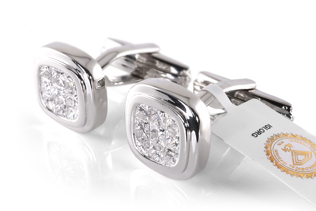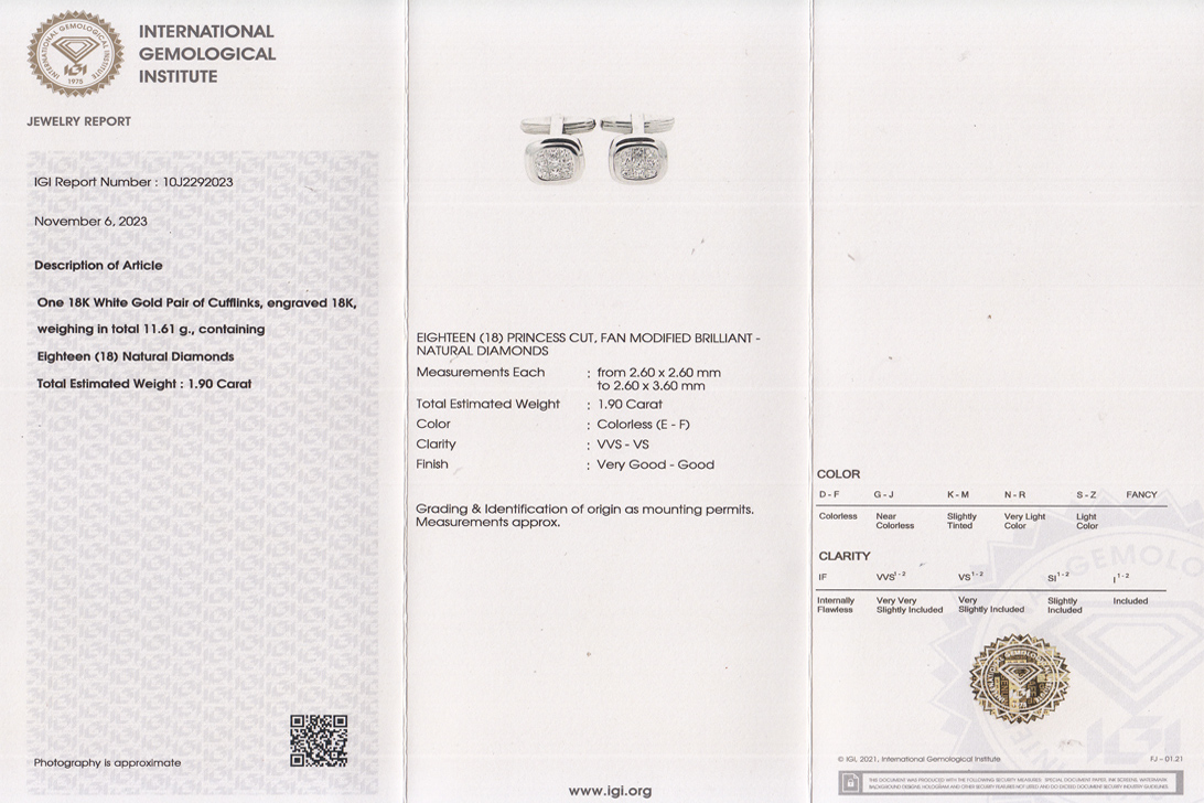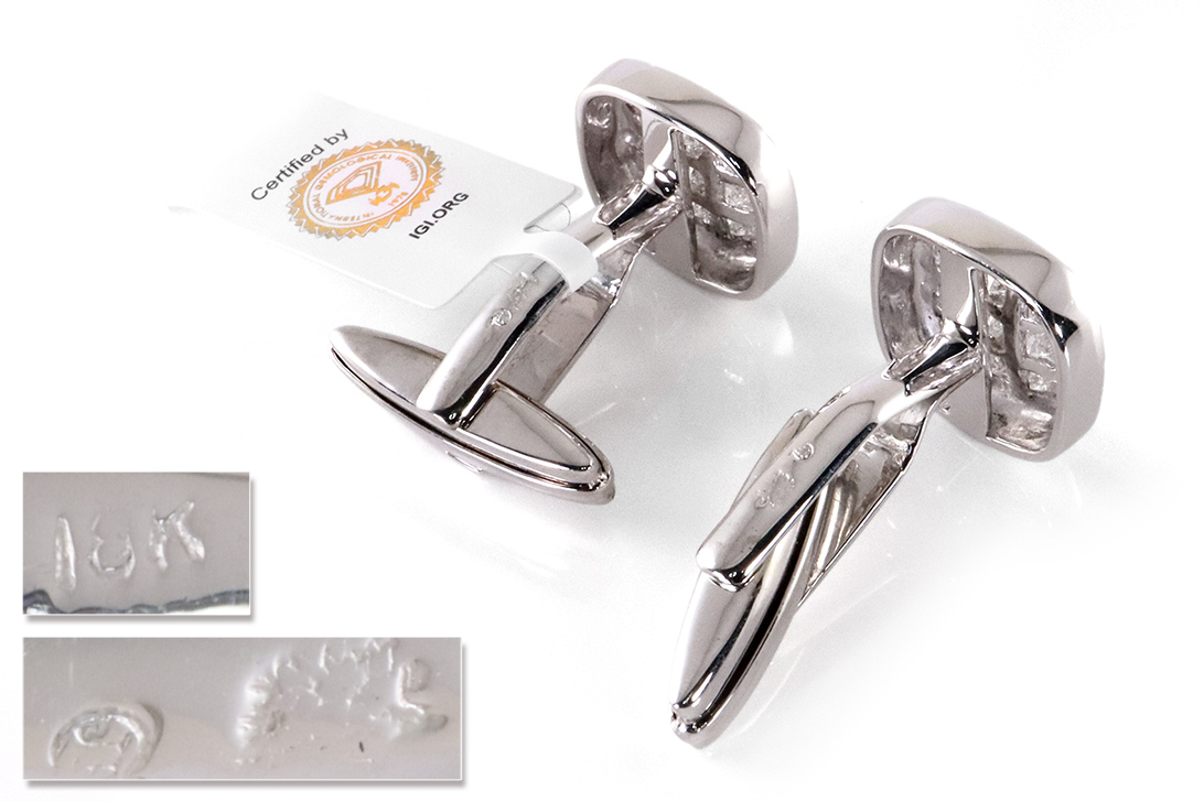 Mit einer Länge von etwa 22 mm und einer Breite von 13 mm besitzen die Manschettenknöpfe ideale Proportionen für den stilbewussten Gentleman. Das hochwertige Weißgold unterstreicht die Brillanz der Steine und verleiht dem Ensemble eine zeitlos-klassische Ausstrahlung.