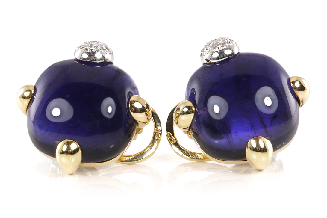 Diese exquisiten Ohrclipse von Pomellato aus der begehrten Kollektion „Griffe“ vereinen italienische Handwerkskunst mit sinnlicher Farbintensität. Gefertigt aus edlem 750er Gelbgold, zeigen sie das für Pomellato typische Zusammenspiel aus harmonischen Formen und leuchtenden Farbedelsteinen. Im Mittelpunkt jedes Clips steht ein prachtvoller Iolith im rechteckigen Cabochonschliff, der mit seiner intensiven lila-blauen Farbe eine faszinierende Tiefe und Lebendigkeit ausstrahlt. Mit einem Gesamtgewicht von rund 22 ct entfalten die beiden Steine eine beeindruckende Präsenz, die Eleganz und Ausdrucksstärke perfekt verbindet.