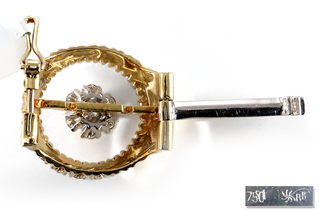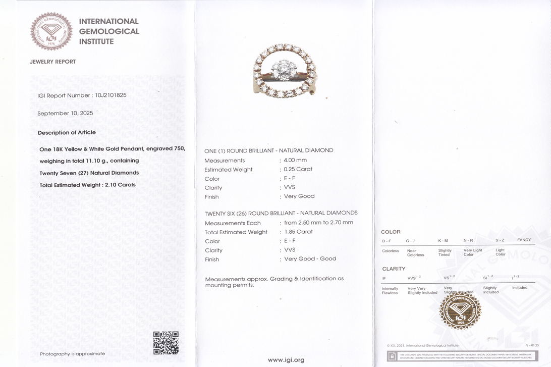 Dieser prachtvolle Clipanhänger vereint luxuriöses Design mit meisterhafter Handwerkskunst und erstrahlt in einer edlen Kombination aus 750er Gelb- und Weißgold. Das harmonische Zusammenspiel der beiden Goldtöne verleiht dem Schmuckstück eine ausdrucksstarke Eleganz und betont die außergewöhnliche Brillanz der insgesamt 27 Diamanten. Diese sind in feinster Präzision im Brillantschliff gefasst und erreichen zusammen ein beeindruckendes Gesamtgewicht von etwa 2,1 Karat.