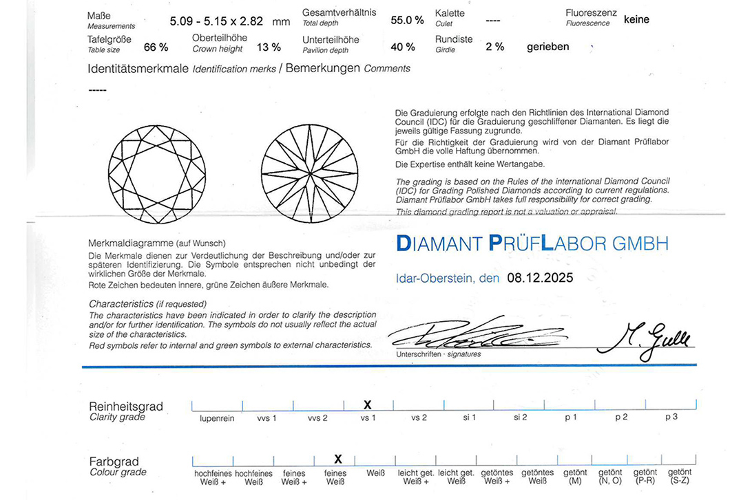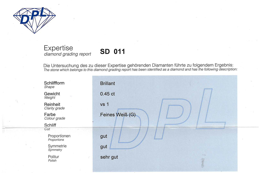 Im Mittelpunkt steht ein brillantgeschliffener Diamant mit einem Gewicht von 0,45 ct. Der Stein zeigt sich in der begehrten Farbe Top Wesselton (G) und verfügt über eine sehr schöne Reinheit VS1. Sein lebendiges Feuer und die präzise Schliffqualität sorgen für eine klare, strahlende Brillanz. Umrahmt wird der Mittelstein von 14 weiteren brillantgeschliffenen Diamanten mit einem Gesamtgewicht von ca. 0,27 ct. Diese Nebensteine in feiner Wesselton-Farbe und VS-Reinheit verleihen dem Ring zusätzliche Tiefe und ein ausgewogenes Funkeln, das den zentralen Diamanten wirkungsvoll hervorhebt.