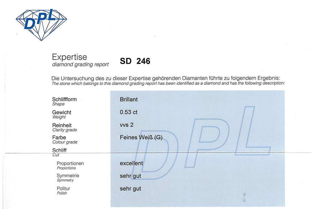 Im Mittelpunkt steht ein beeindruckender Diamant im Brillantschliff mit einem Gewicht von 0,53 ct. Durch seinen präzisen Schliff entfaltet der Stein ein lebendiges und intensives Lichtspiel. Mit der Farbqualität Feines Weiß (G) und der außergewöhnlich hohen Reinheit VVS2 zeigt der Diamant eine besonders klare und strahlende Erscheinung, die dem Ring eine exklusive Ausstrahlung verleiht.