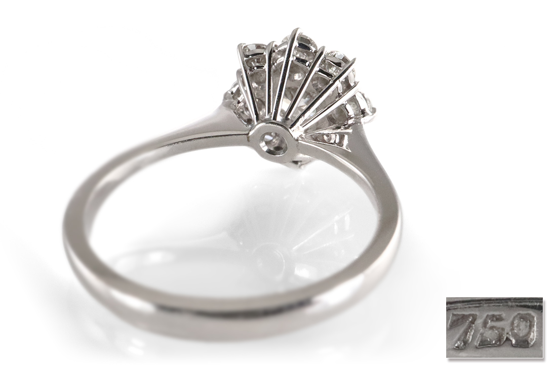 Umgeben wird der Solitär von acht kleineren Brillanten mit einem Gesamtgewicht von rund 0,40 Karat, ebenfalls in der Farbe Top Wesselton und Reinheit VS. Diese sind in perfekter Symmetrie um den zentralen Stein arrangiert und verleihen dem Ring eine luxuriöse Strahlkraft, die dennoch elegant und fein wirkt.