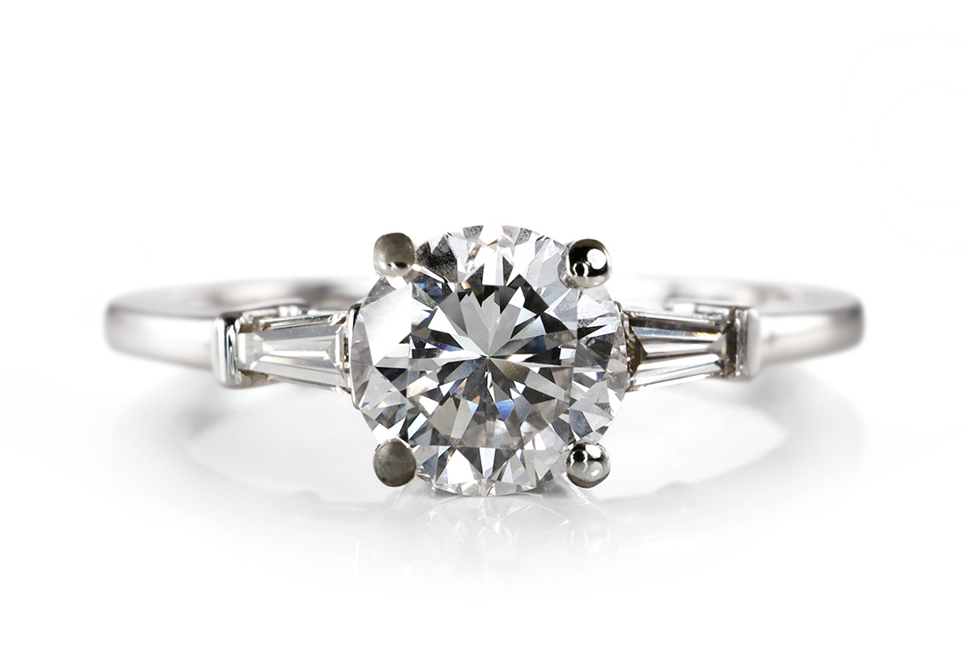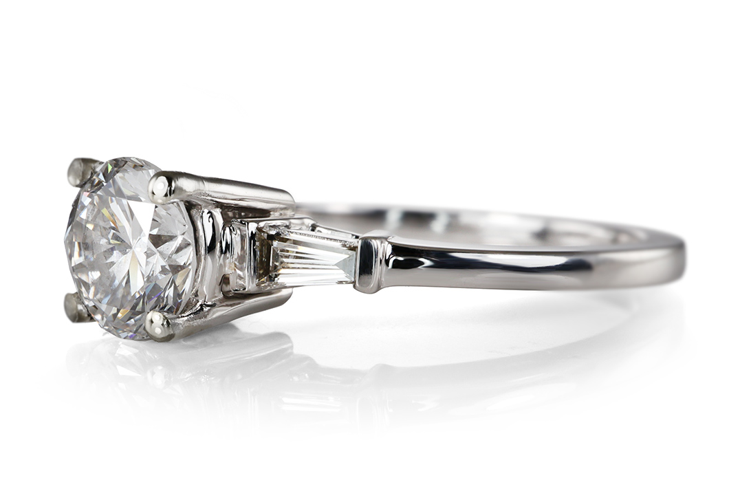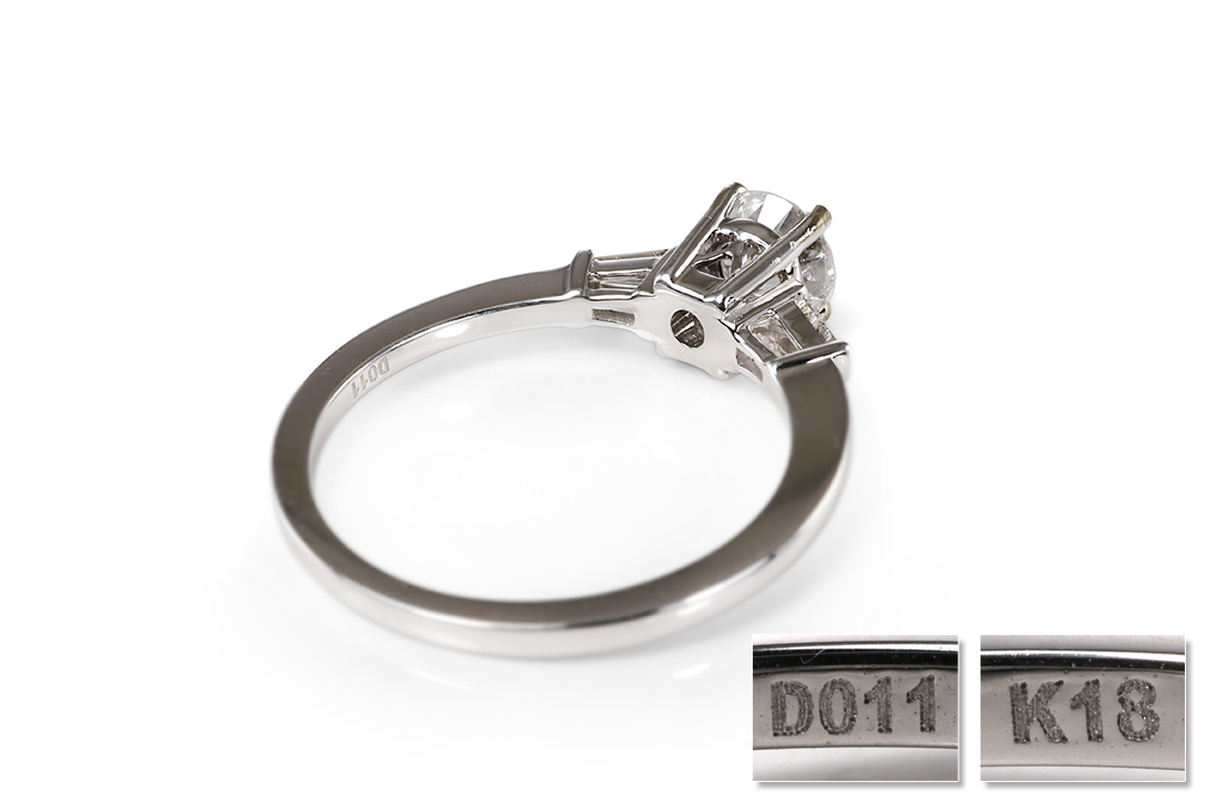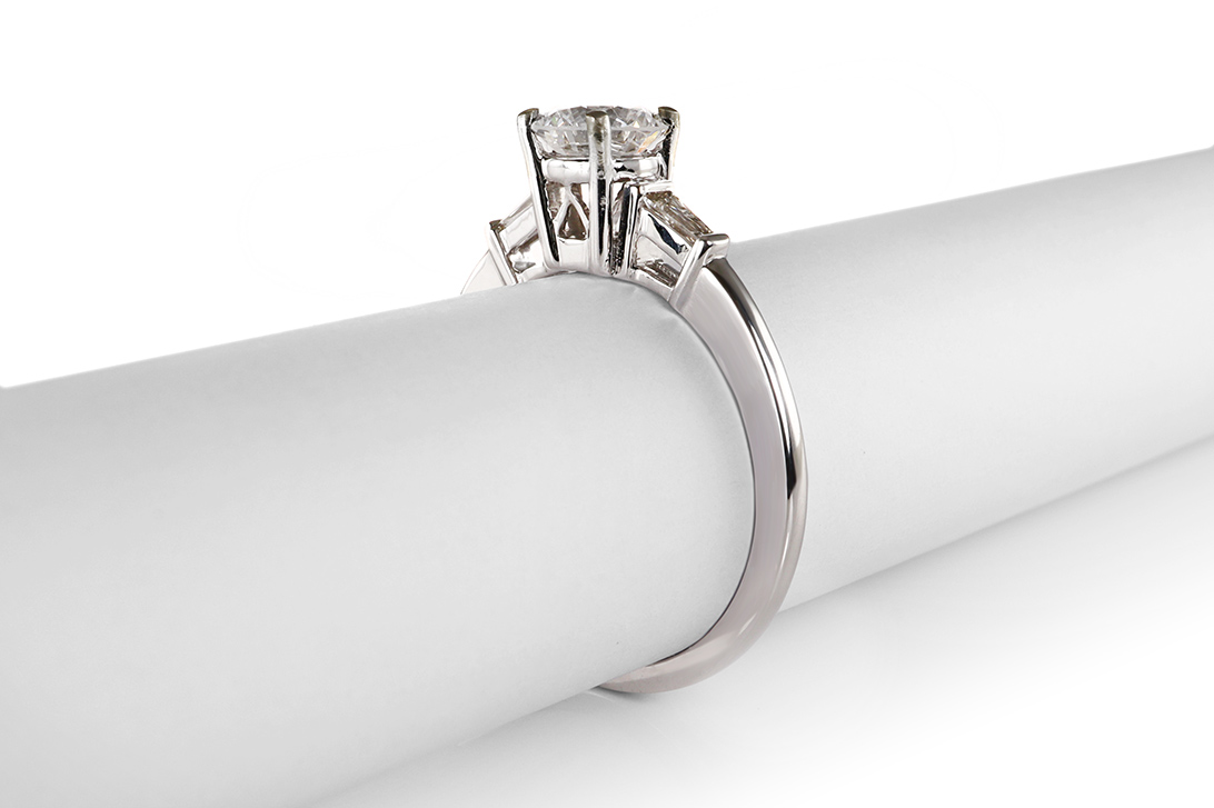 Flankiert wird der Hauptdiamant von zwei trapezförmig geschliffenen Diamanten, die zusammen etwa 0,11 Karat aufweisen. Mit ihrer Top-Wesselton-Farbe und der Reinheit VS setzen sie klare, funkelnde Akzente, die den zentralen Stein harmonisch einrahmen. Die geometrische Form der Seitensteine verleiht dem Ring eine elegante Struktur und betont gleichzeitig die schlanke, geschmackvolle Silhouette des Designs.