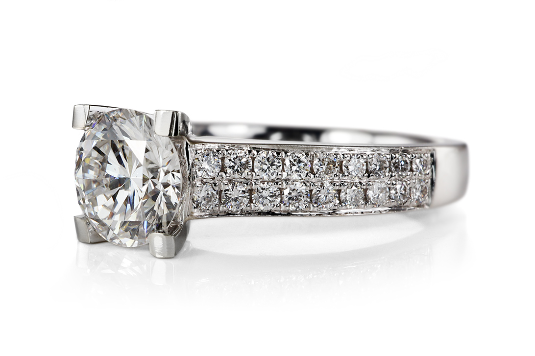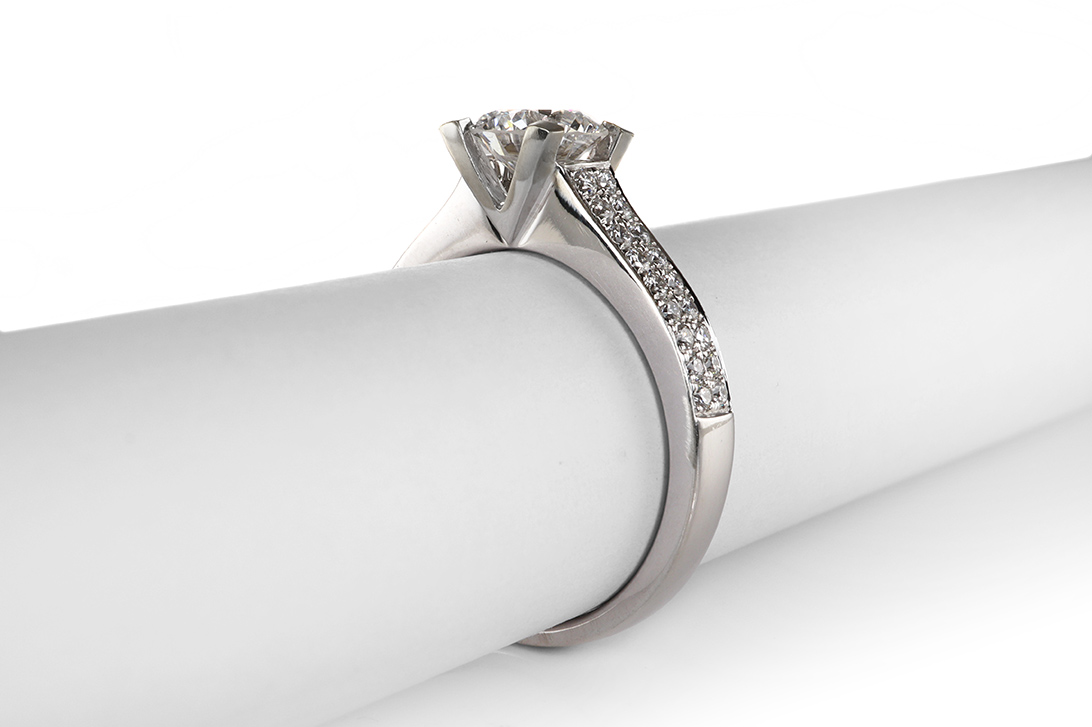 Umrahmt wird der Hauptstein von insgesamt 36 weiteren Brillanten mit zusammen etwa 0,32 ct, die in Top Wesselton und VS-Reinheit ausgewählt wurden. Diese fein proportionierten Diamanten verleihen dem Ring eine funkelnde Brillanz, die sich harmonisch über den Ringkopf und entlang der Schiene verteilt. Die präzise Fassung und die durchgehend hochwertige Goldschmiedearbeit lassen die Steine optimal zur Geltung kommen und betonen den luxuriösen Charakter des Schmuckstücks.