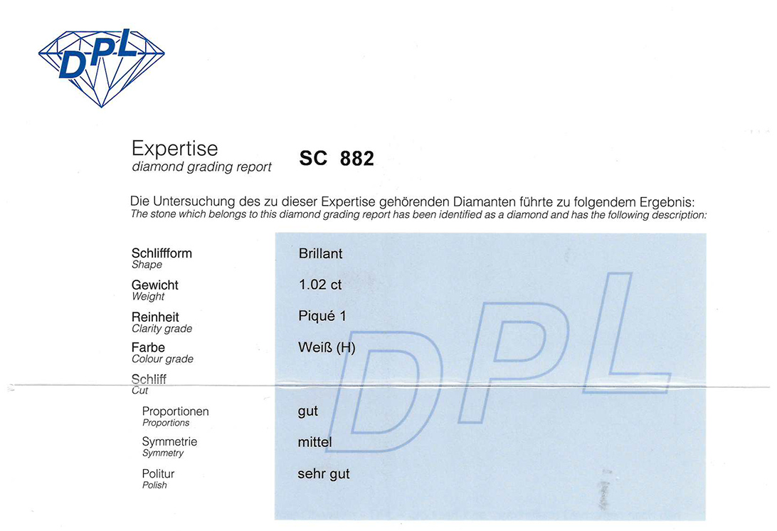 Im Zentrum steht ein eindrucksvoller Brillant mit einem Gewicht von 1,02 ct. Seine weiße Farbe im Bereich H sorgt für ein klares, lebendiges Feuer, während der Brillantschliff die Lichtreflexionen optimal zur Geltung bringt. Der Mittelstein wird von einer fein ausgearbeiteten Fassung gehalten, die sowohl Stabilität als auch Eleganz vermittelt.
