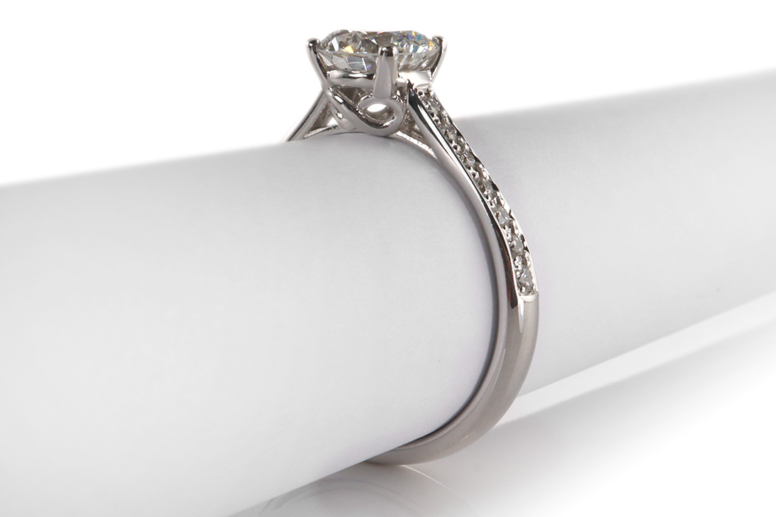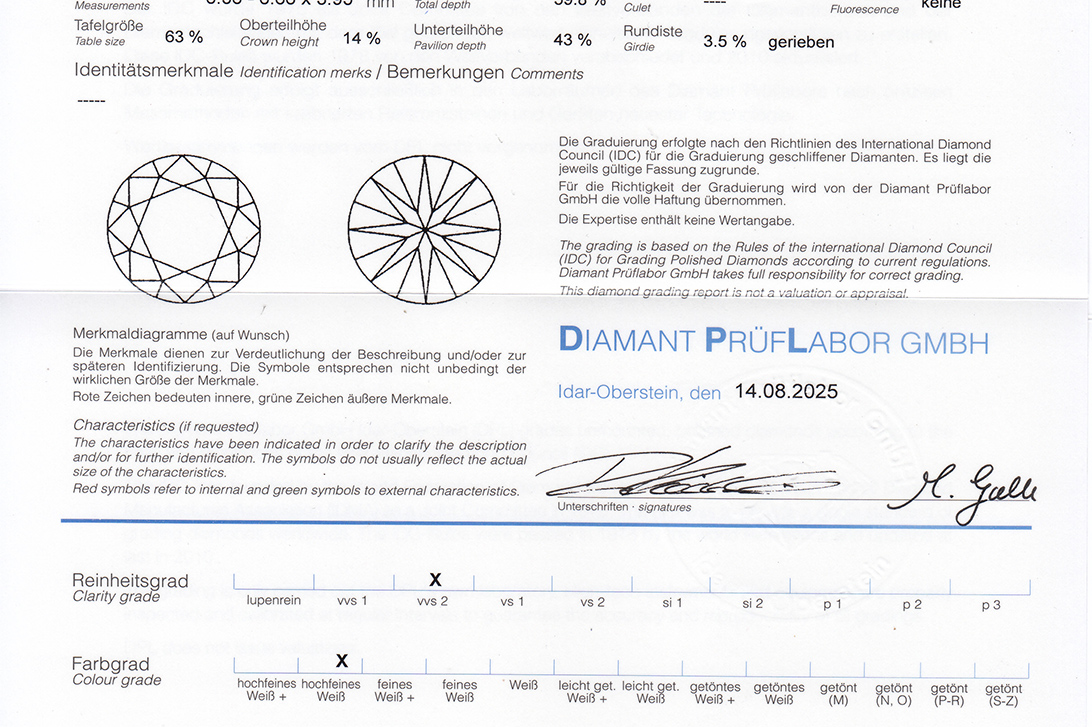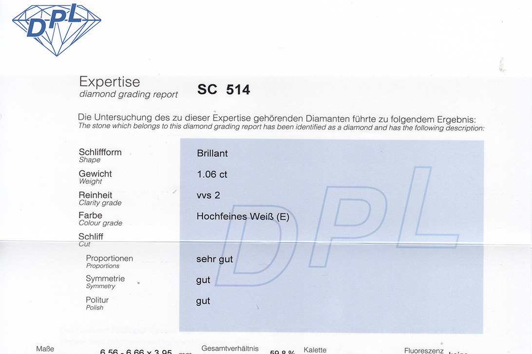 Ergänzt wird der Hauptdiamant von 14 weiteren Brillanten mit einem Gesamtgewicht von ca. 0,18 Karat. Diese Begleitsteine in der Qualität Top Wesselton und VS bilden ein funkelndes Ensemble, das den zentralen Stein harmonisch einrahmt und seine Leuchtkraft noch stärker zur Geltung bringt. Die präzise gesetzten Diamanten verleihen dem Ring eine luxuriöse Vollendung und unterstreichen seine hohe Wertigkeit.