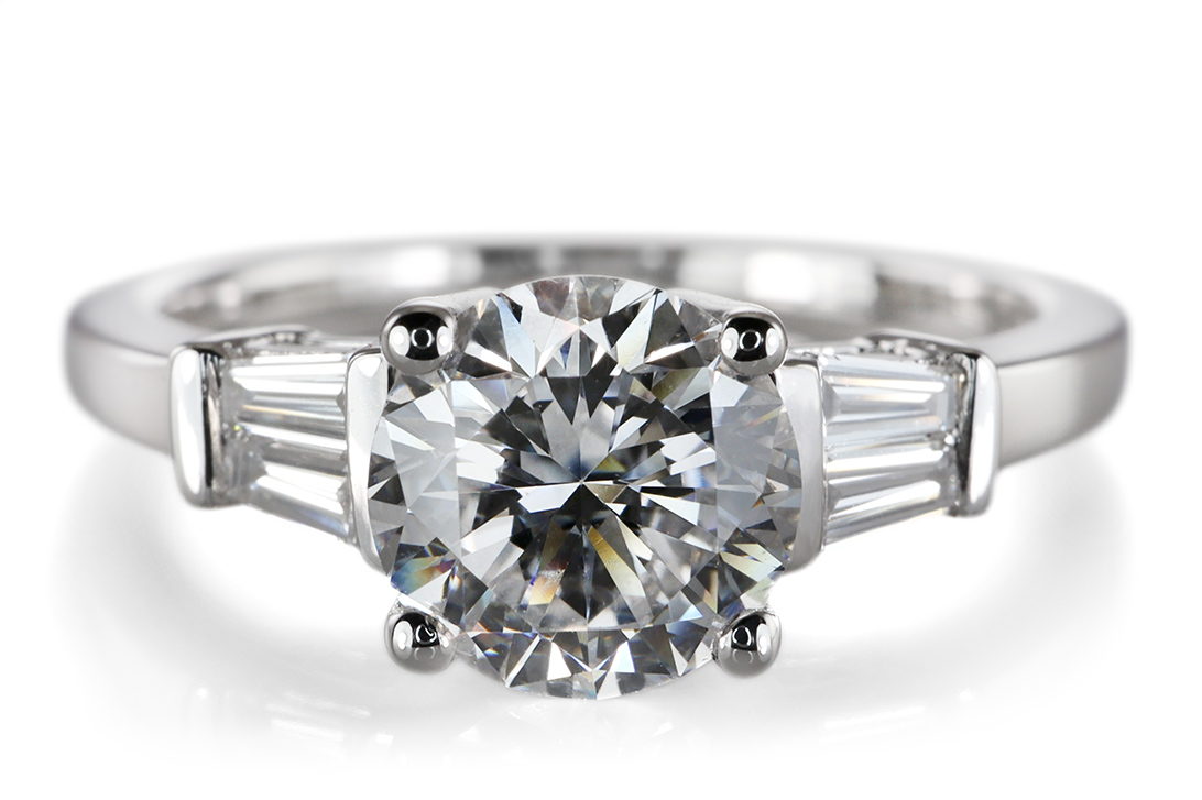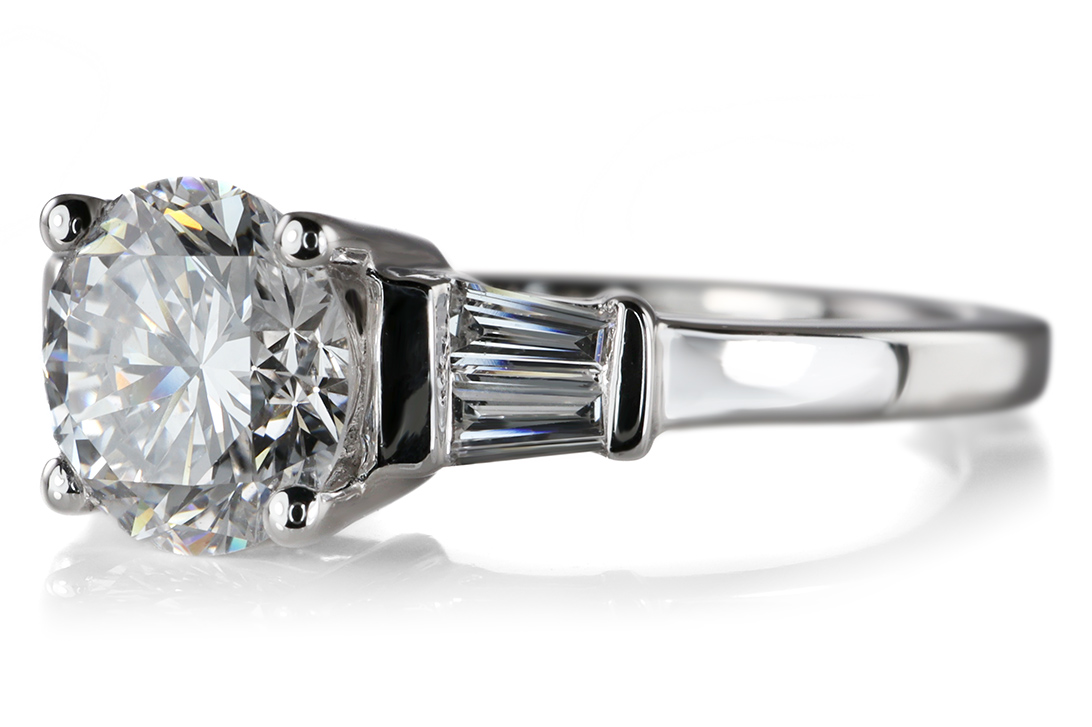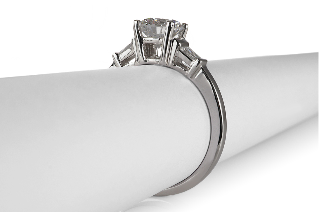 Flankiert wird der Hauptdiamant von vier weiteren Diamanten im eleganten Trapezschliff mit einem Gesamtgewicht von ca. 0,16 ct. Diese fein abgestimmten Seitensteine unterstreichen die Wirkung des Mittelsteins und sorgen für eine moderne, architektonische Anmutung. Die Farbstufe Top Wesselton sowie die Reinheit VS fügen sich harmonisch in das hochwertige Gesamtbild ein.
