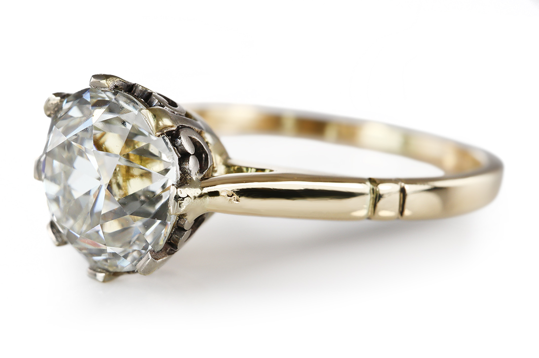 Im Mittelpunkt steht ein beeindruckender Diamant im historischen Altschliff mit einem Gewicht von ca. 1,58 ct. Dieser besondere Schliff ist für seine charakteristische Lichtwirkung bekannt und erzeugt ein weiches, lebendiges Funkeln mit bemerkenswerter Tiefe. Der Diamant besitzt die Farbe getöntes Weiß (K), wodurch sich eine warme, charmante Nuance ergibt, die hervorragend mit dem Gelbgold harmoniert. Mit einer Reinheit von VS2 präsentiert sich der Stein zudem klar und ausdrucksstark.