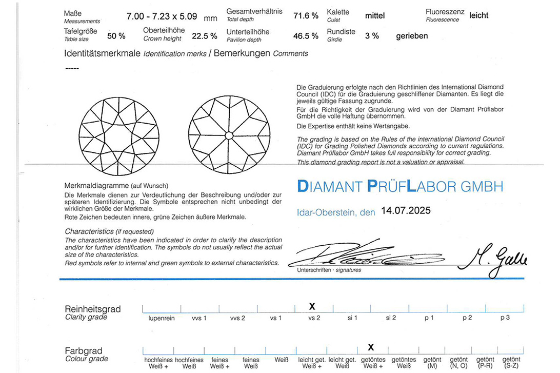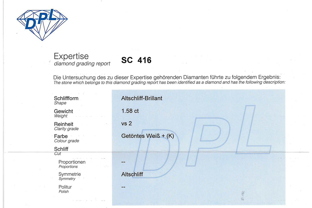 Ein besonderes Highlight ist das zugehörige DPL-Gutachten, das die Qualität und Eigenschaften des Diamanten dokumentiert.