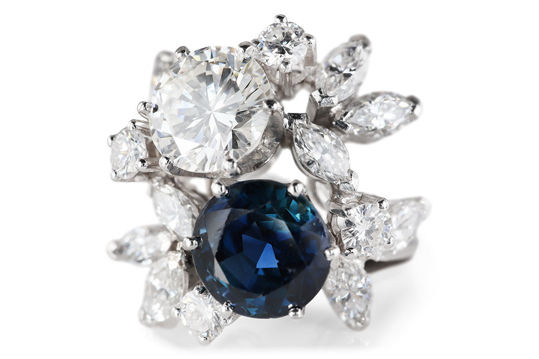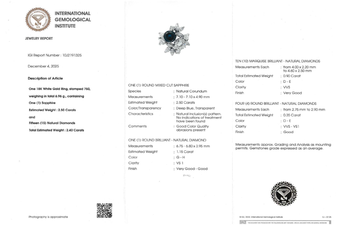 Umgeben wird der Saphir von 15 Diamanten mit einem Gesamtgewicht von ca. 2,4 ct. Die Steine präsentieren sich in den feinen Farbnuancen D–E–F–G–H und mit Reinheiten von VVS bis VS1. Der raffinierte Wechsel aus Brillant- und Marquiseschliff sorgt für ein lebendiges, facettenreiches Lichtspiel und unterstreicht die exklusive Ausstrahlung des Rings. Der großzügig gestaltete Ringkopf mit ca. 18,0 x 18,2 mm und einer Höhe von ca. 9,1 mm verleiht dem Schmuckstück eine eindrucksvolle Präsenz am Finger.