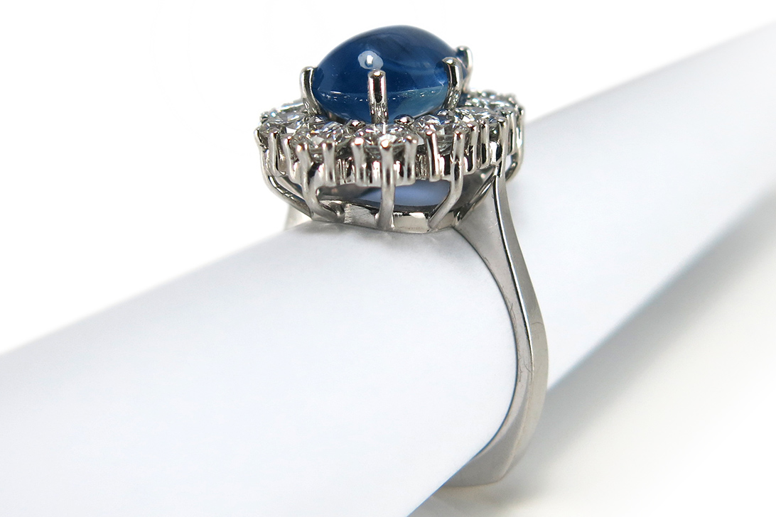Dieser Damenring besticht durch seine eindrucksvolle Kombination aus Farbstein und Brillanz. Im Zentrum thront ein Saphir von ca. 5,19 ct, der mit seiner ovalen Form und den Maßen von etwa 11,09 x 8,08 x 5,87 mm ein imposantes Farbenspiel entfaltet. Der Cabochonschliff betont die Tiefe des Edelsteins und verleiht ihm eine weiche, geheimnisvolle Ausstrahlung, die das Licht auf besonders elegante Weise reflektiert.