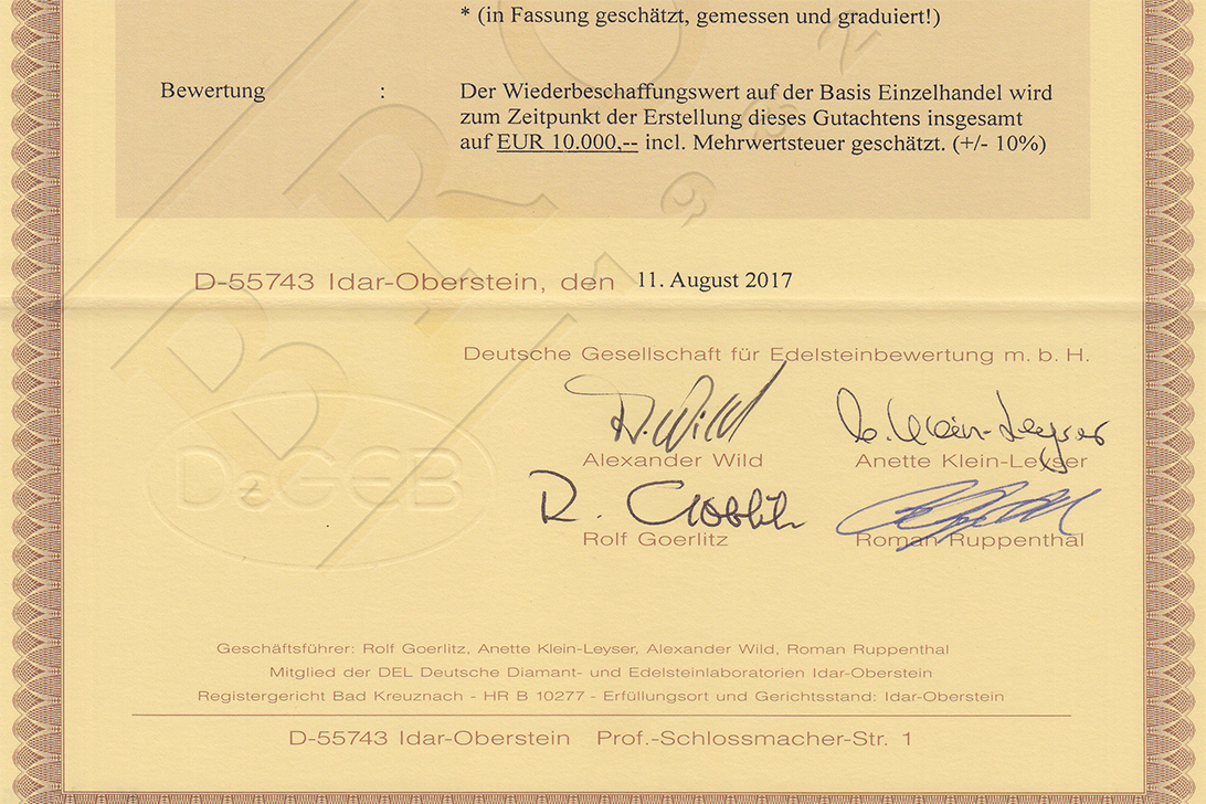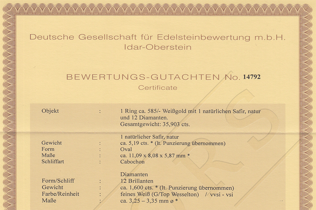Umgeben wird der Saphir von zwölf erlesenen Diamanten im Brillantschliff. Mit einem Gesamtgewicht von ca. 1,60 ct, in der Farbe Top Wesselton und mit Reinheiten von VVSI bis VSI, setzen sie funkelnde Akzente und unterstreichen die intensive Farbwirkung des zentralen Edelsteins. Die sorgfältige Fassung in 585/- Weißgold betont die klare Linie und die edle Strahlkraft des Designs.