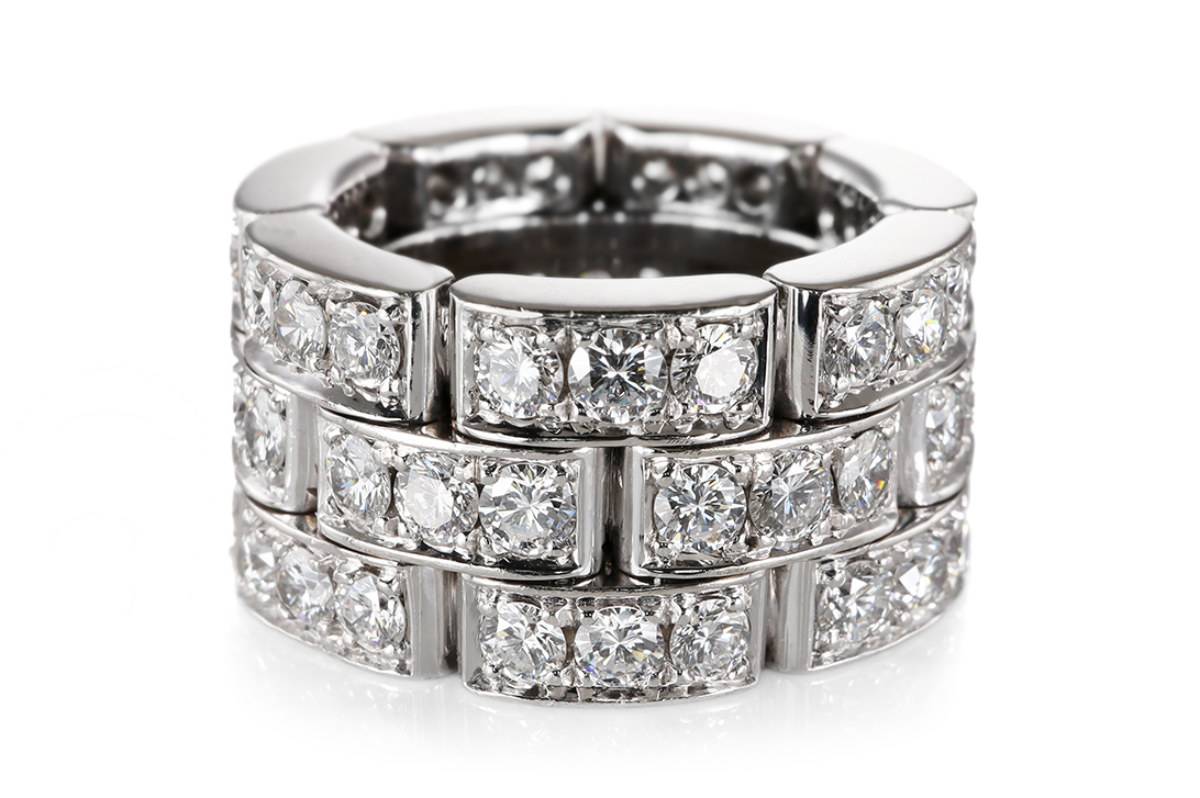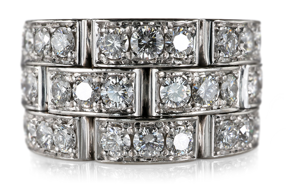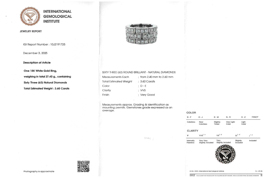 Die Oberfläche wird vollständig von insgesamt 63 fein aufeinander abgestimmten Diamanten geschmückt, die ein beeindruckendes Gesamtgewicht von ca. 3,60 ct. aufweisen. Alle Steine sind im klassischen Brillantschliff gearbeitet und überzeugen durch ihre außergewöhnliche Qualität. Die Farbe im seltenen Bereich River (D–E) verleiht den Diamanten eine außergewöhnliche Brillanz und Reinheit, die durch die sehr hohe Reinheitsstufe VVS zusätzlich betont wird. Das gleichmäßige Funkeln über die gesamte Ringfläche sorgt für ein luxuriöses, homogenes Erscheinungsbild mit intensiver Lichtwirkung.