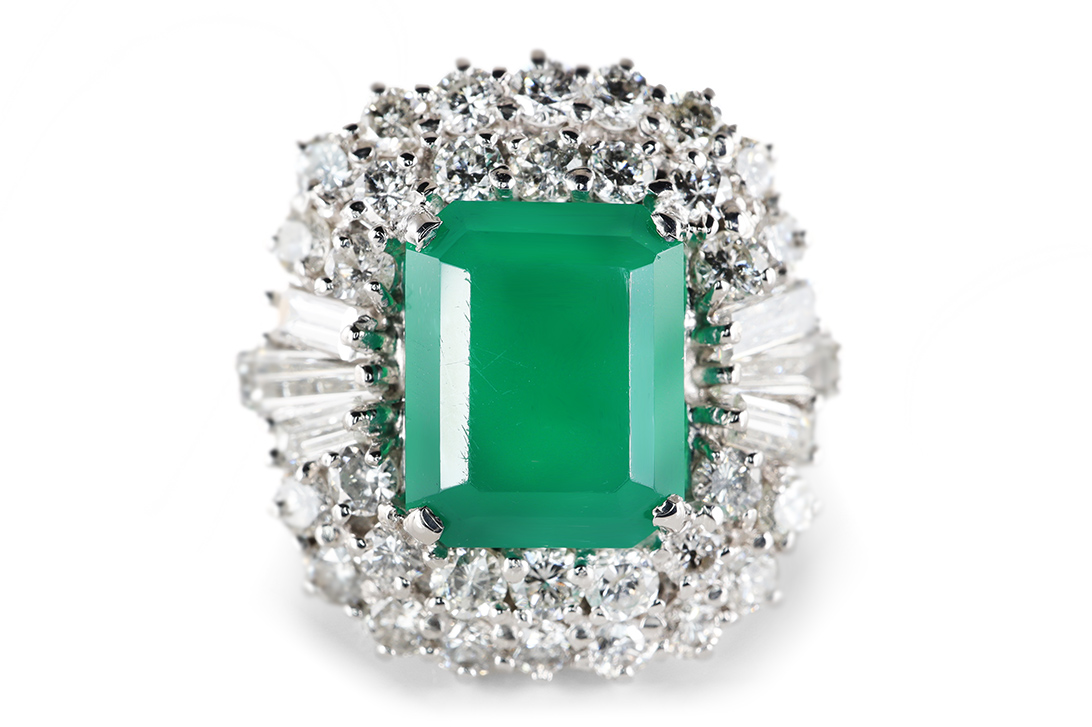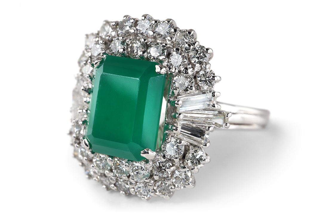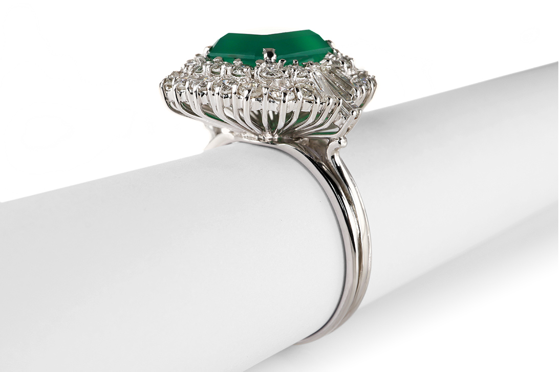 Im Mittelpunkt steht ein Chrysopras mit einem Gewicht von ca. 2,6 ct, der durch seine außergewöhnliche Farbe in deep bluish green sofort ins Auge fällt. Der Smaragdschliff unterstreicht die Transparenz des Steins und verleiht ihm eine elegante, ruhige Tiefe. Umrahmt wird dieser zentrale Edelstein von insgesamt 38 Diamanten, die das Design auf stilvolle Weise ergänzen.