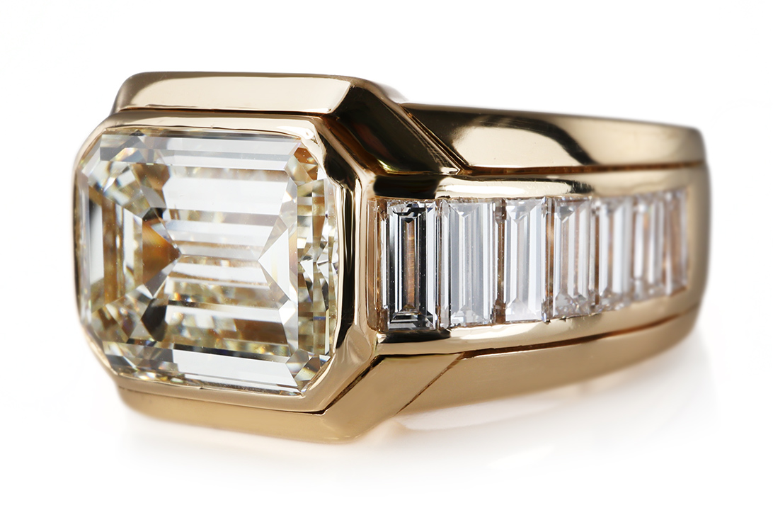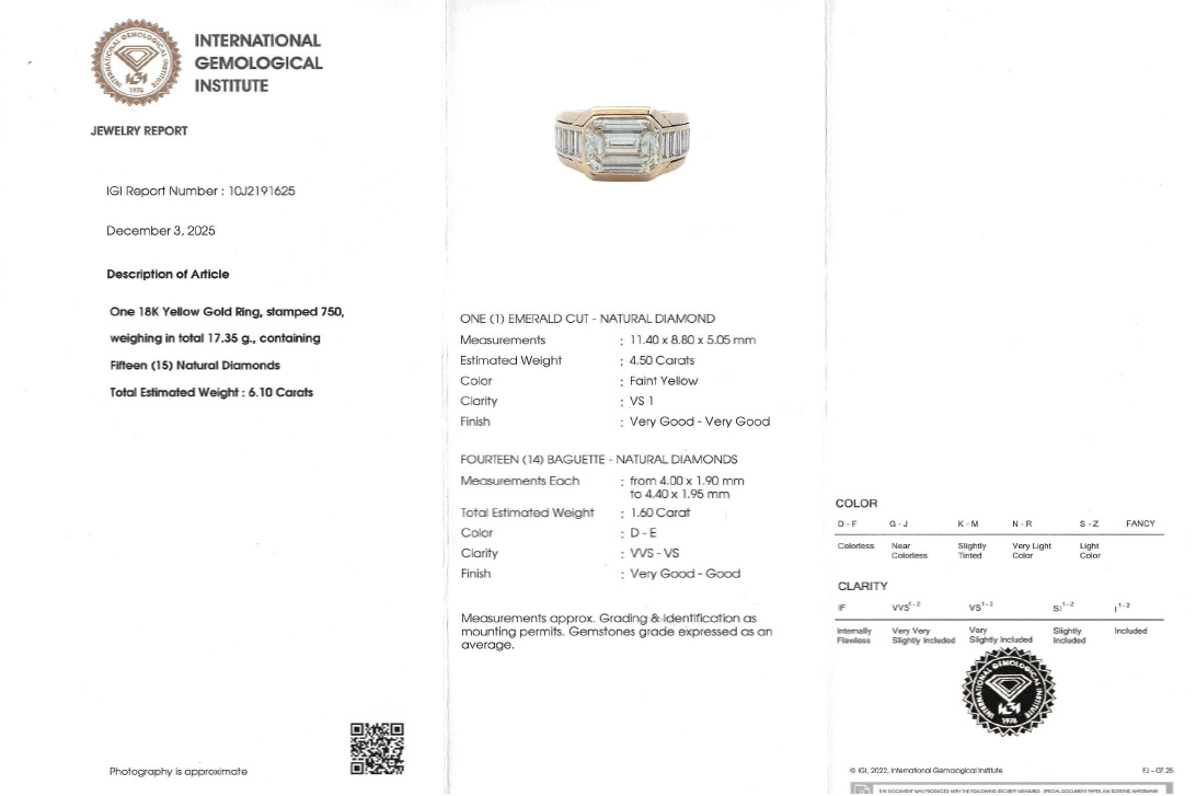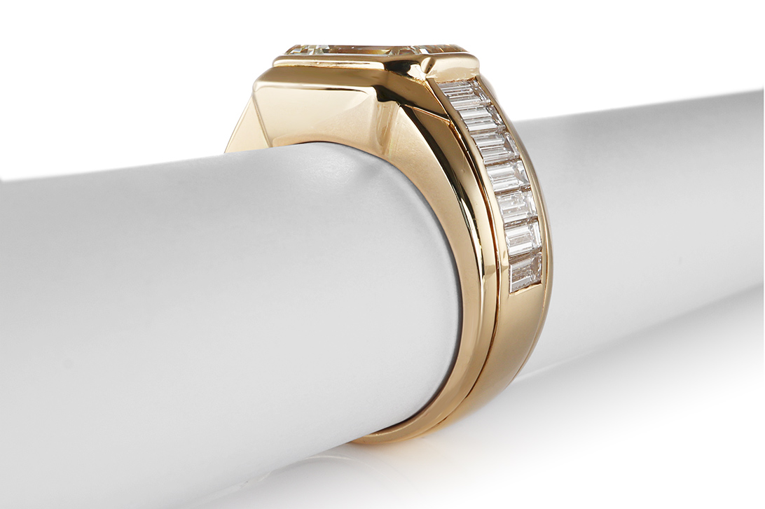 Dieser Ring hat eine ausdrucksstarke Präsenz und verbindet klassische Eleganz mit eindrucksvoller Edelsteinqualität. Gefertigt aus massivem 750/- Gelbgold überzeugt er durch seine harmonischen Proportionen und die wertige Verarbeitung, die dem Schmuckstück eine zeitlose Ausstrahlung verleiht. Im Zentrum steht ein außergewöhnlicher Diamant im Smaragdschliff mit einem Gewicht von ca. 4,5 Karat. Seine dezente Fancy-Färbung im Bereich Faint Yellow (J–K) verleiht dem Stein eine warme, edle Note, während die Reinheit von VS1 für eine klare und lebendige Lichtwirkung sorgt.
