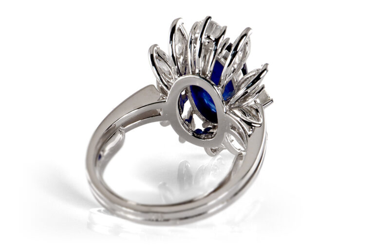 Dieser Ring vereint meisterhafte Goldschmiedekunst mit faszinierender Edelsteinpracht. Gefertigt aus edlem 750er Weißgold präsentiert sich dieses exklusive Schmuckstück als eindrucksvolles Beispiel traditioneller Handwerkskunst, signiert von Juwelier Theodor Heiden, königlich bayerischer Hofgoldschmied in München. Im Zentrum des Designs thront ein unbehandelter Saphir von ca. 5,2 ct in intensivem Deep Violetish Blue. Der fein geschliffene Oval Cabochon verleiht dem Edelstein eine besonders sanfte und zugleich geheimnisvolle Ausstrahlung.