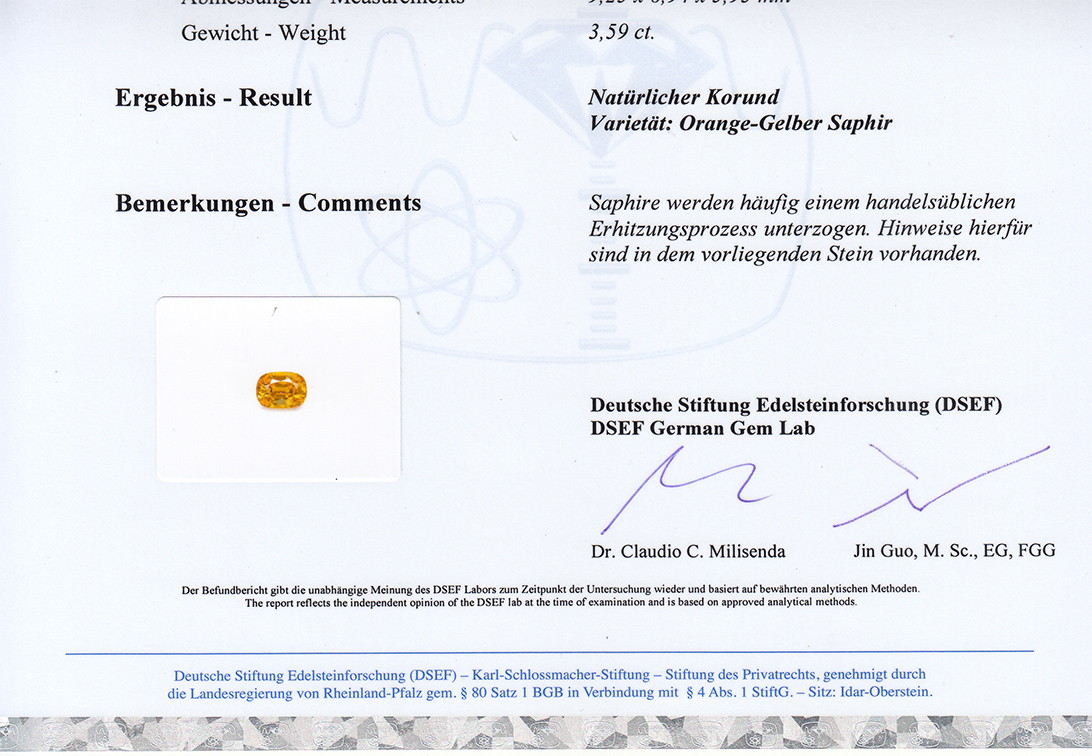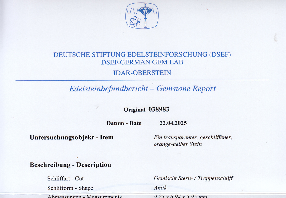 Dieser Damenring präsentiert sich als eindrucksvolles Schmuckstück, das mit seiner außergewöhnlichen Farbkomposition und edlen Materialien begeistert. Im Zentrum thront ein beeindruckender Saphir von ca. 3,59 Karat, der durch seine intensive Farbnuance in Orange-Gelb eine unverwechselbare Ausstrahlung besitzt. Der Stein zeigt sich im raffinierten gemischten Stern-Treppenschliff, der sowohl Brillanz als auch Tiefe unterstreicht und dem Ringkopf eine markante Präsenz verleiht.