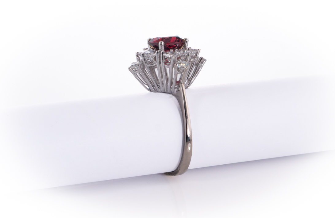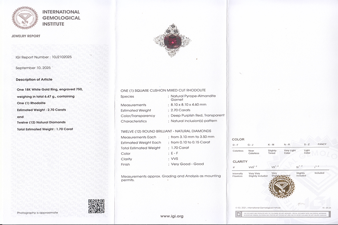 Dieser Ring besticht durch seine außergewöhnliche Eleganz und die harmonische Verbindung edler Materialien. Gefertigt aus hochwertigem 750er Weißgold, präsentiert sich das Schmuckstück mit einem eindrucksvollen Rhodolithen (Almandit-Granat) als zentralem Blickfang. Der Hauptstein mit einem Gewicht von etwa 2,70 Karat fasziniert durch seine intensive Farbe in einem tief purpurroten Ton („Deep Purplish Red“) und seinen feinen Cushion-Mixed-Schliff, der das Licht in lebendigen Reflexen einfängt. Umgeben wird der prachtvolle Mittelstein von zwölf funkelnden Diamanten im Brillantschliff, die zusammen rund 1,7 Karat aufweisen. Ihre herausragende Qualität mit einer Farbskala von E–F und einer Reinheit von VVS unterstreicht den luxuriösen Charakter des Rings.