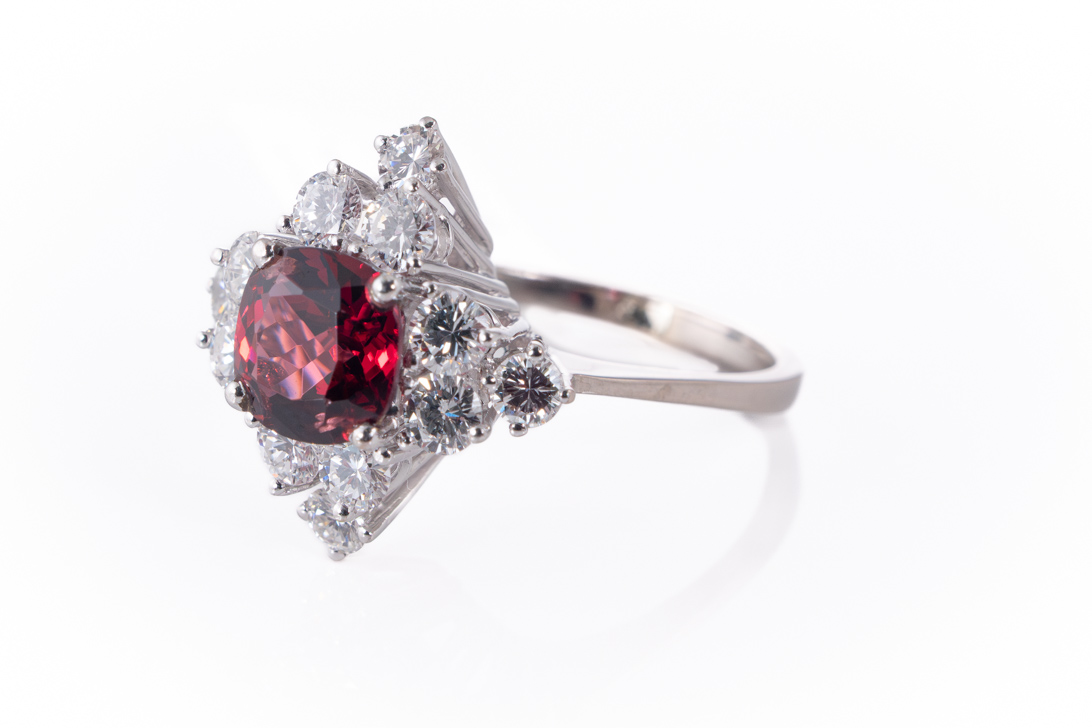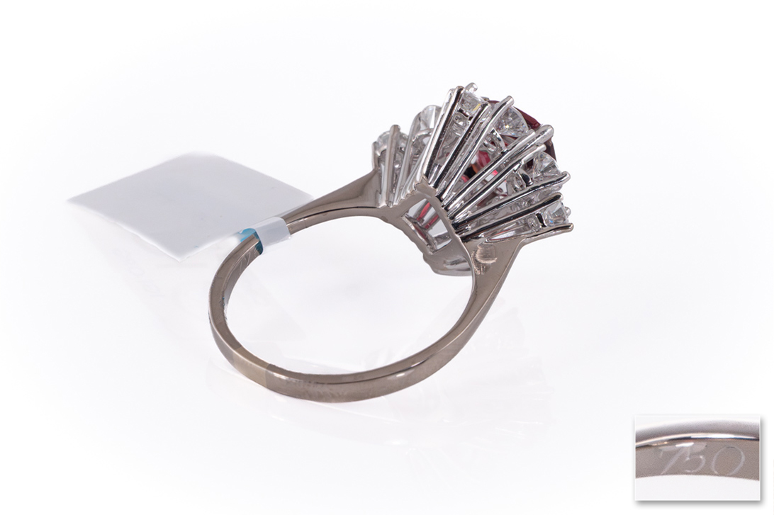 Ring Rhodolith 2,7 ct + 12 Brillanten 1,7 ct E-F/VVS 750 Gold IGI [BRORS 20453]