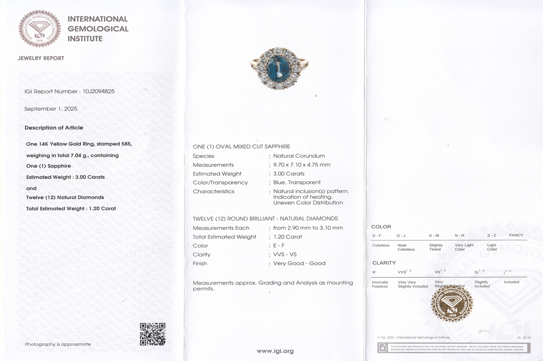 Dieser Damenring aus 585er Gelbgold präsentiert sich als edles Schmuckstück von besonderer Ausdruckskraft. Im Zentrum thront ein intensiver blauer Saphir von etwa 3,0 Carat, dessen Transparenz und lebendige Farbintensität durch den ovalen Mixed Cut perfekt zur Geltung kommen. Dieses Hauptjuwel zieht sofort den Blick auf sich und verleiht dem Ring eine majestätische Ausstrahlung.