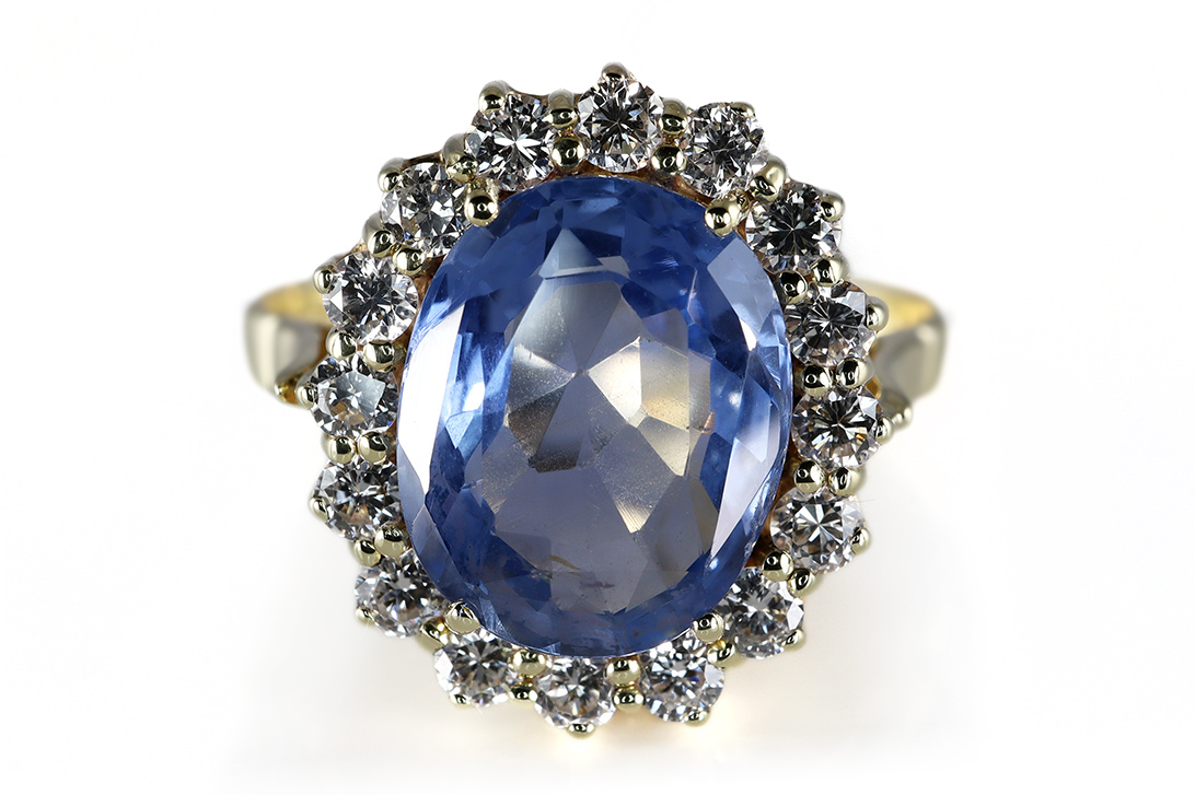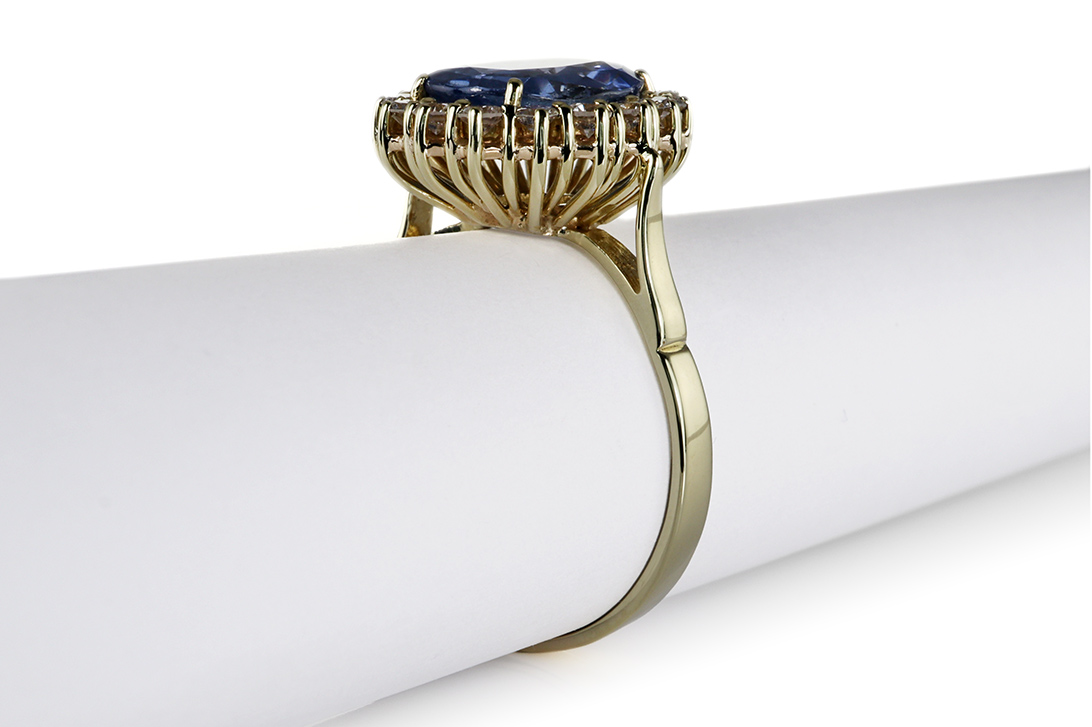 Um den Saphir sind 16 Diamanten im feinen Brillantschliff angeordnet, die zusammen ein Gesamtgewicht von ca. 0,60 ct aufweisen. Mit ihrer Farbe E–F und einer hohen Reinheit von VVS–VS sorgen sie für ein lebendiges Funkeln und setzen elegante Lichtakzente. Die Diamanten unterstreichen die Wertigkeit des Rings und schaffen einen edlen Kontrast zur intensiven Farbe des Saphirs.