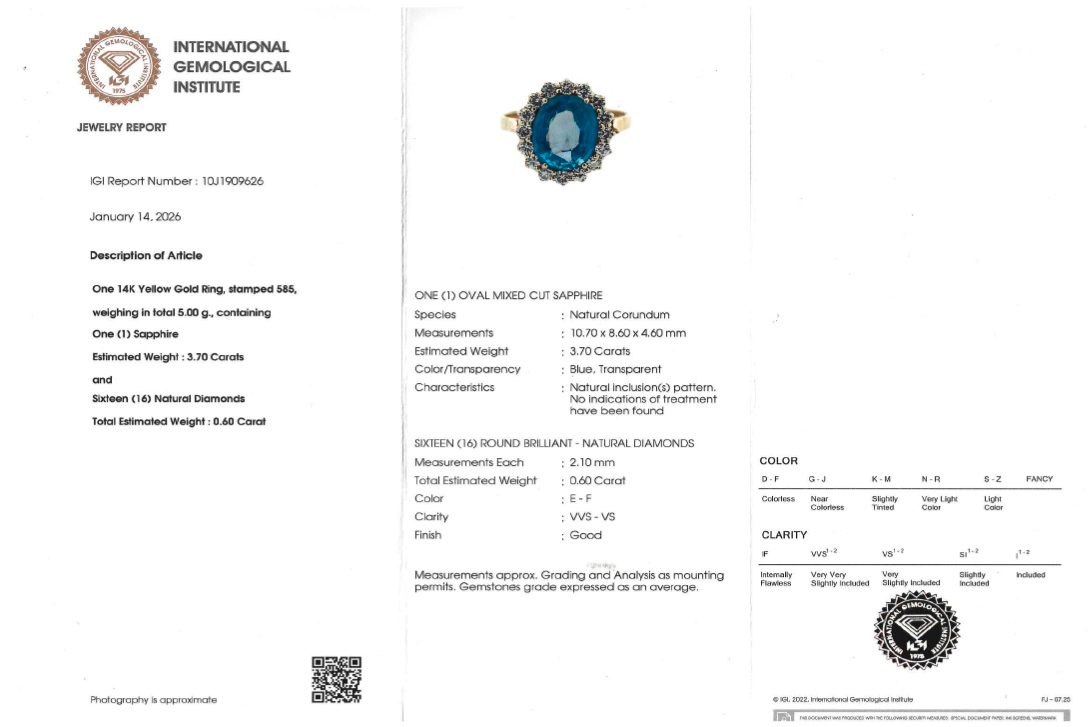 Dieser Ring hat eine ausdrucksstarke Erscheinung und vereint klassische Eleganz mit einem eindrucksvollen Edelsteinbesatz. Gefertigt aus 585/- Gelbgold, bildet die warme Goldfarbe einen harmonischen Rahmen für den zentral gefassten Saphir. Der unbehandelte Saphir mit einem Gewicht von ca. 3,7 ct präsentiert sich in einem transparenten, tiefen Blauton und überzeugt durch seine natürliche Ausstrahlung. Der ovale Mixed Cut bringt die Farbintensität und Tiefe des Edelsteins besonders schön zur Geltung und verleiht dem Ringkopf eine markante Präsenz.