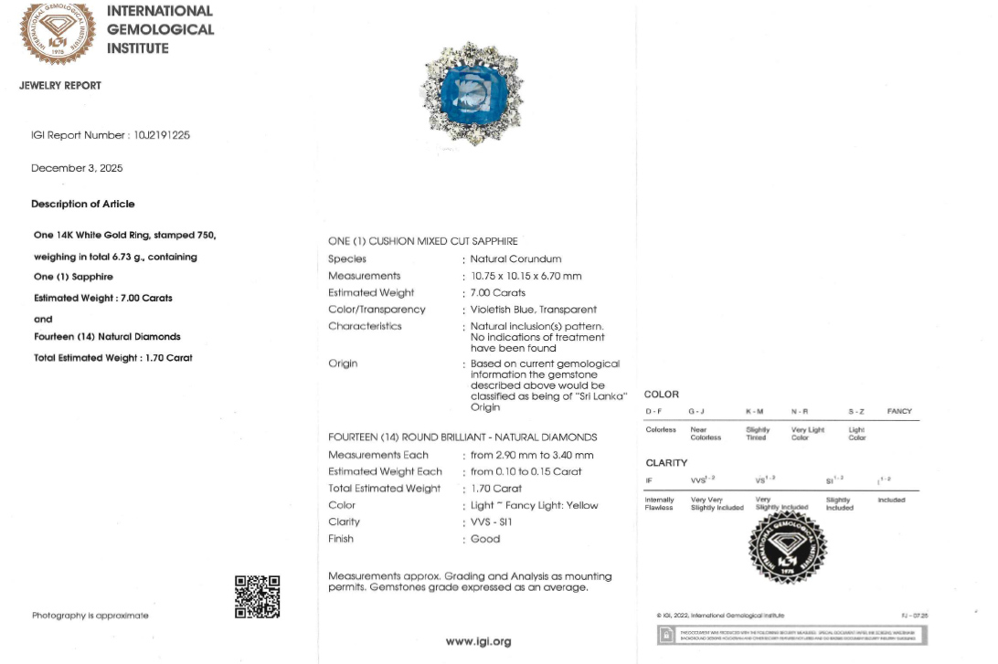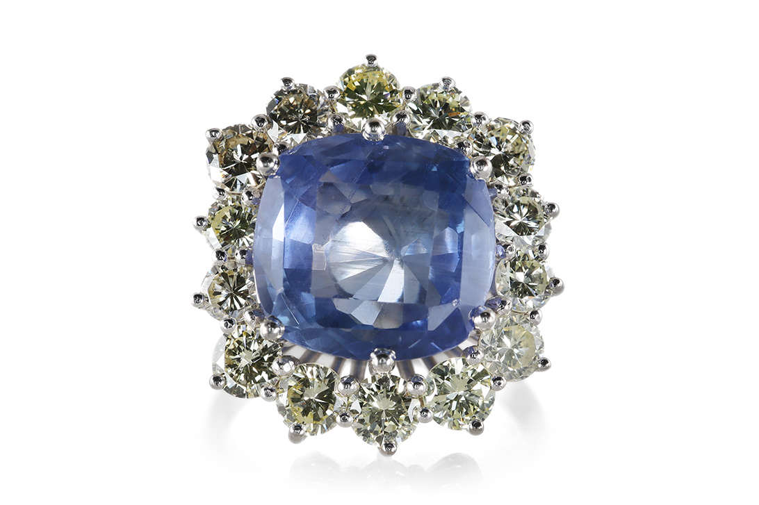 Im Mittelpunkt steht ein außergewöhnlicher Saphir aus Sri Lanka mit einem Gewicht von ca. 7,0 ct. Der Edelstein ist unbehandelt und zeigt sich in der faszinierenden Farbe Violetish Blue, transparent und lebendig. Der Cushion Mixed Cut unterstreicht die Tiefe und das Farbspiel des Saphirs und lässt ihn besonders weich und zugleich kraftvoll wirken. Umrahmt wird der Mittelstein von 14 Diamanten im klassischen Brillantschliff mit einem Gesamtgewicht von ca. 1,70 ct. Die Diamanten präsentieren sich in der besonderen Farbe Light Fancy Light Yellow und einer hohen Reinheit von VVS bis SI1, was einen spannenden und luxuriösen Kontrast zum kühlen Blau des Saphirs schafft.