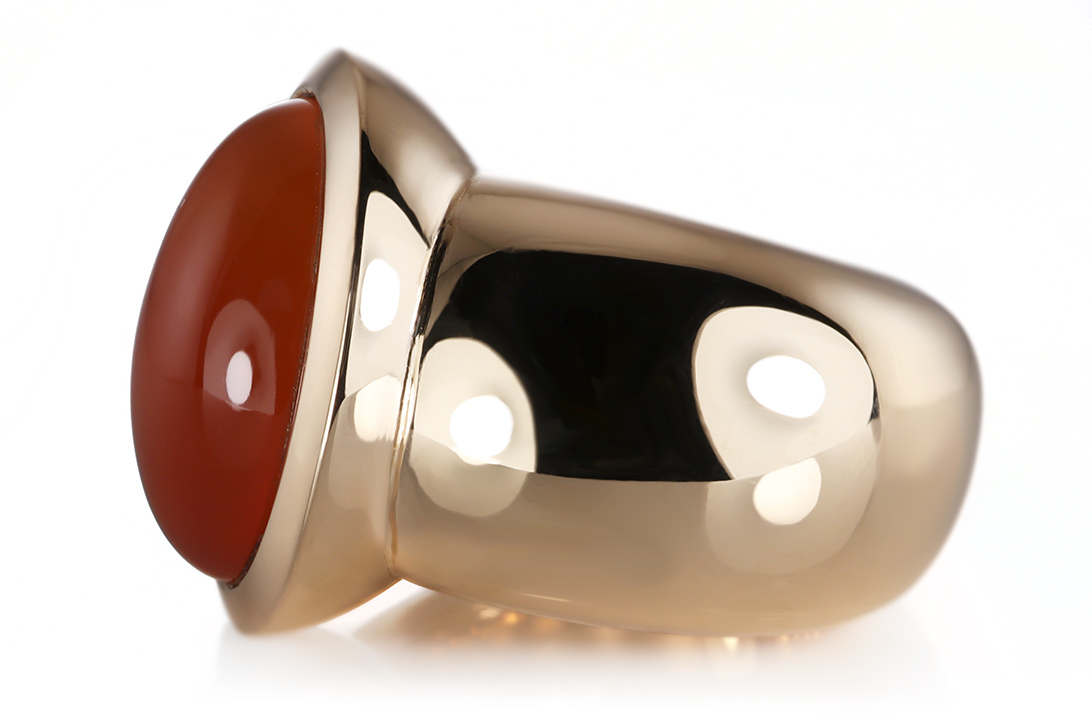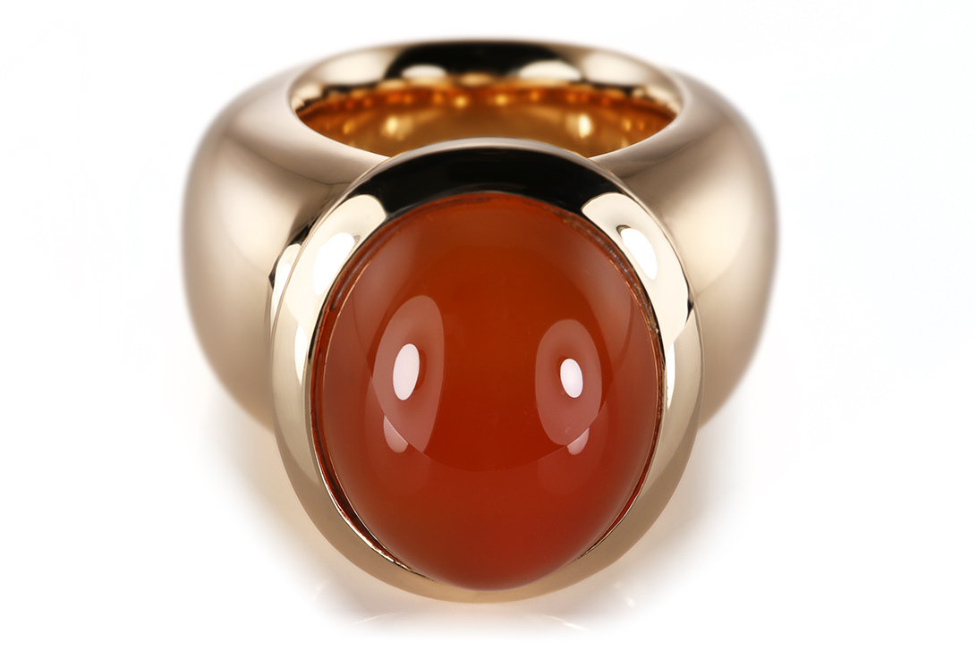 Im Mittelpunkt steht ein fein gearbeiteter Karneol im Cabochonschliff. Seine glatte, gewölbte Oberfläche bringt die satte braune Farbgebung besonders wirkungsvoll zur Geltung und verleiht dem Ring eine elegante, fast königliche Anmutung. Der großzügig gestaltete Ringkopf misst ca. 24,1 x 19,8 mm bei einer Höhe von ca. 12,9 mm und sorgt für eine markante, selbstbewusste Erscheinung. Die kraftvolle Ringschiene mit einer Breite von ca. 14,2 mm im hinteren Bereich unterstreicht die solide Verarbeitung und das luxuriöse Tragegefühl.