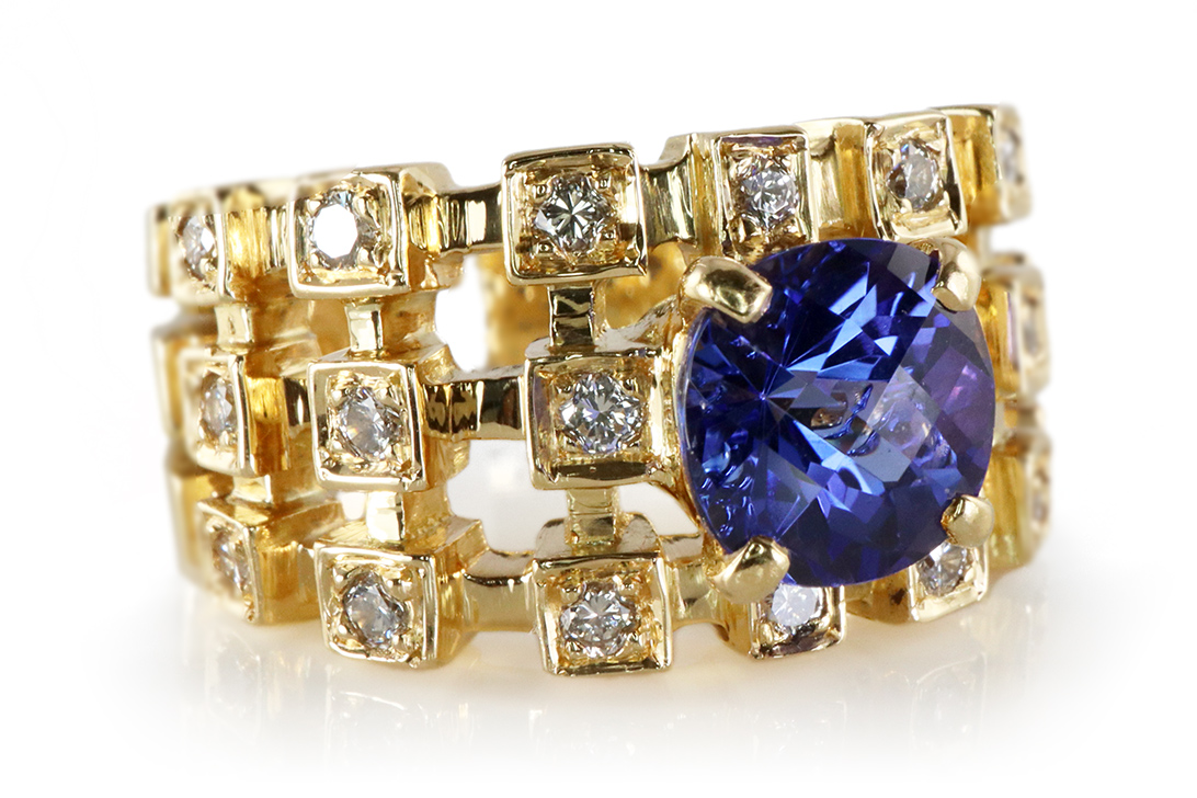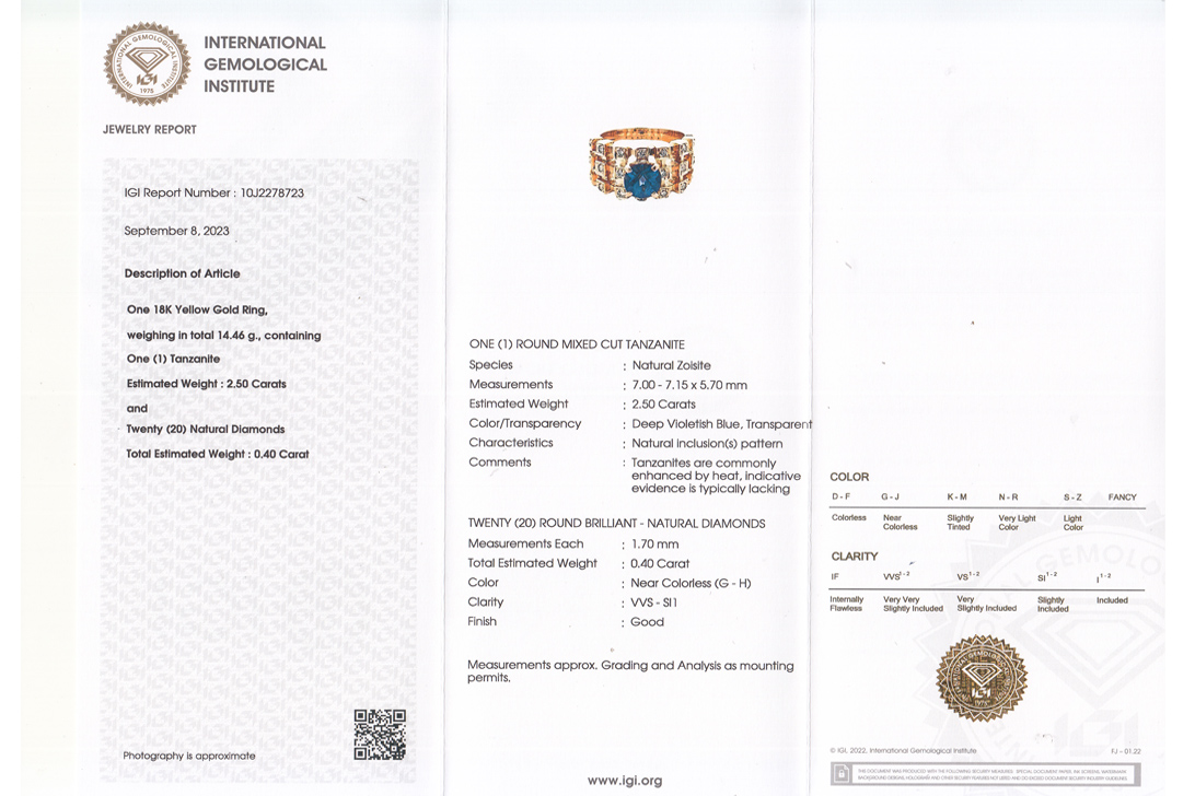 Der Hauptstein wird von 20 funkelnden Diamanten eingerahmt, die gemeinsam ein Gesamtgewicht von rund 0,40 ct aufweisen. Ihre Farbqualität von G–H und Reinheit VVS–SI unterstreicht den kostbaren Charakter des Rings und sorgt für ein strahlendes Zusammenspiel zwischen Gold und Edelsteinen. Der Brillantschliff der Diamanten sorgt dabei für maximale Lichtreflexion und ein leuchtendes Funkeln, das den Tansanit perfekt akzentuiert.