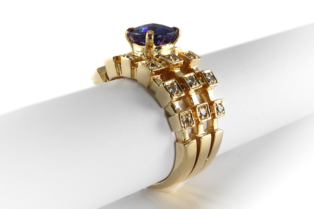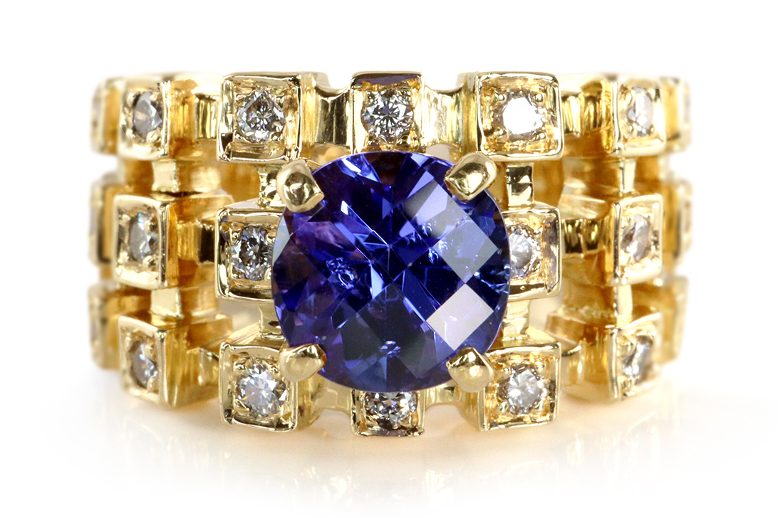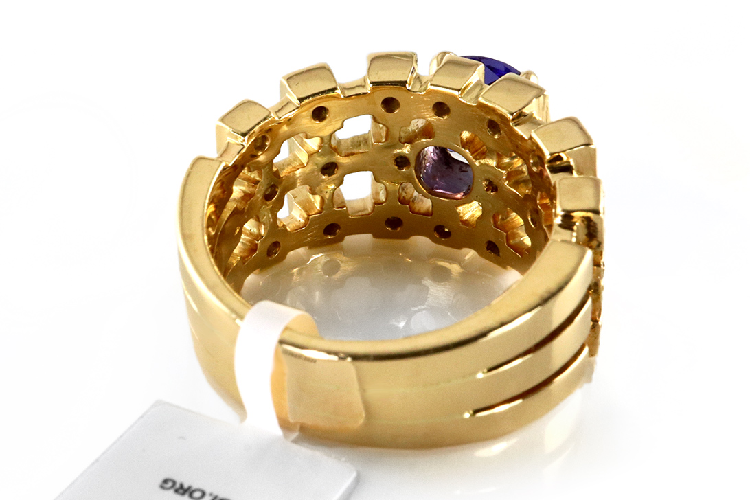 Dieser außergewöhnliche Damenring aus edlem 750/- Gelbgold vereint luxuriöse Ausstrahlung mit ausdrucksstarker Farbbrillanz. Im Zentrum thront ein prachtvoller Tansanit von etwa 2,50 ct, dessen intensiv violettblauer Farbton und feine Transparenz ihm eine faszinierende Tiefe verleihen. Der Round Mixed Cut bringt das Farbspiel des Edelsteins eindrucksvoll zur Geltung und lässt ihn bei jedem Lichteinfall in einem sanften, geheimnisvollen Glanz erstrahlen.
