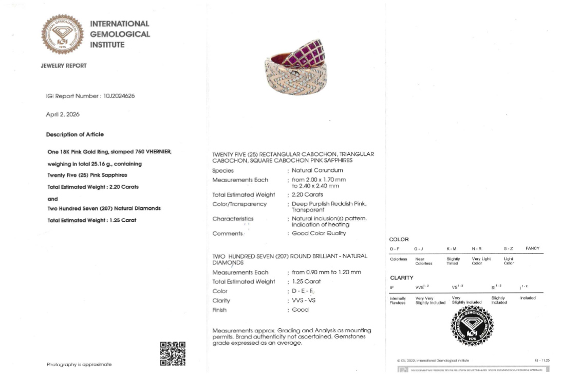 Im Zentrum stehen 25 pinke Saphire mit einem Gesamtgewicht von ca. 2,20 ct, die in unterschiedlichen Schliffarten wie Rechteck-, Dreieck- und Cabochonschliff ausgeführt sind. Ihre intensive Farbgebung in deep purplish reddish Pink verleiht dem Ring eine lebendige und zugleich edle Ausstrahlung. Die transparenten Edelsteine fügen sich kunstvoll in das Design ein und erzeugen ein faszinierendes Farbspiel.
