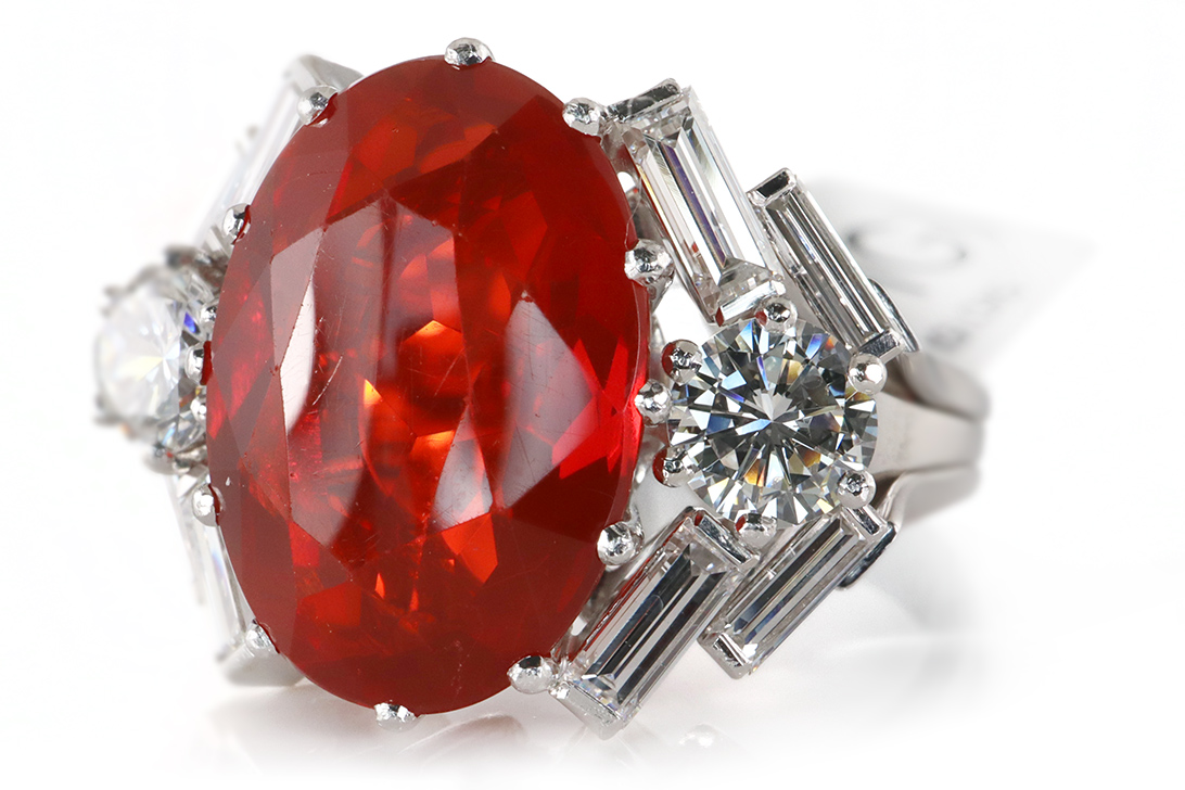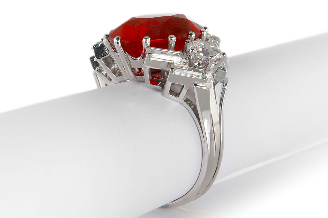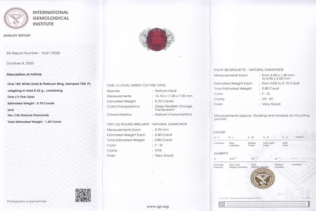 Der Feueropal wird von zwei funkelnden Brillanten flankiert, die zusammen etwa 0,80 Karat aufweisen. Mit ihrer feinen Farbqualität F–G und der hervorragenden Reinheit VVS verleihen sie dem Ring zusätzliche Strahlkraft. Ergänzend dazu schmücken acht weitere Diamanten im präzisen Baguetteschliff die Komposition. Diese bringen zusammen rund 0,80 Karat auf die Waage und präsentieren sich ebenfalls in edler Farbskala F–G bei Reinheiten von VS bis SI1.