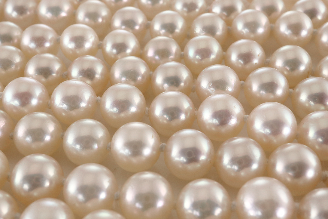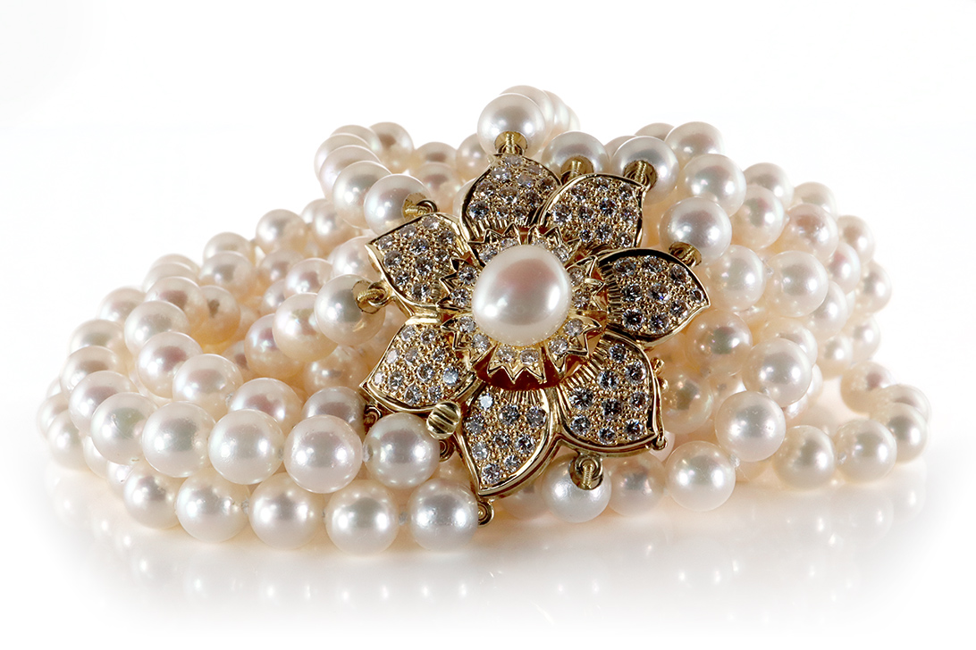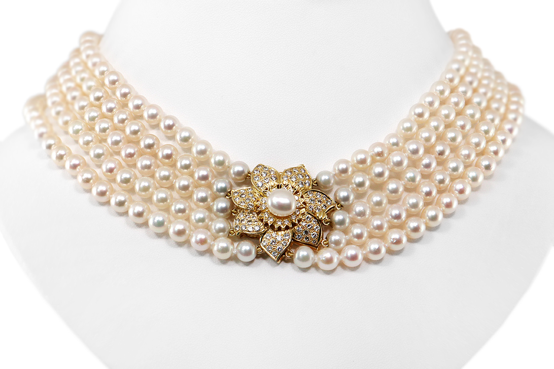 Dieses außergewöhnliche Collier besticht durch seine erlesene Kombination aus feinsten Perlen und edlen Diamanten. Es besteht aus fünf Strängen schimmernder Salzwasserperlen, ergänzt durch eine zentral gesetzte Süßwasser-Kulturperle. Die gleichmäßig runden Perlen beeindrucken mit ihrem intensiven Lüster und changierenden Farbspiel in Weiß mit zarten Nuancen von Grün, Rosa und Silber. Diese harmonische Farbtiefe verleiht dem Schmuckstück eine luxuriöse und zugleich feminine Ausstrahlung.