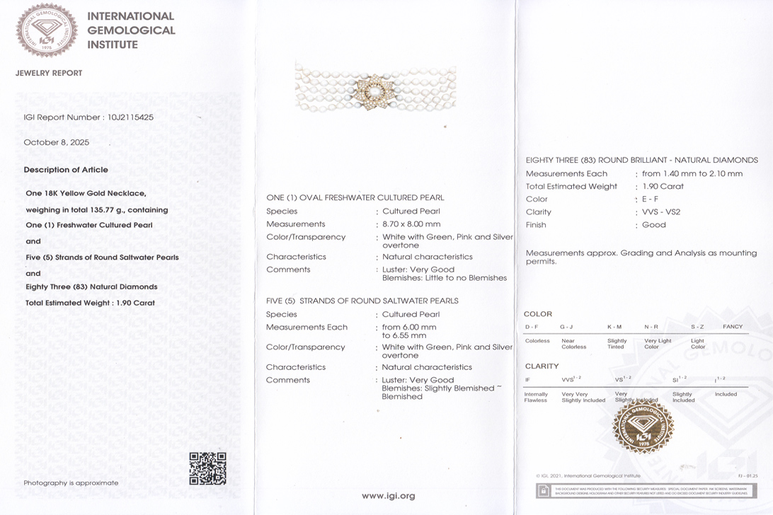 Das Collier besitzt eine Länge von ca. 42 cm und schließt mit einem sicheren Kastenschlossverschluss. Dieses Schmuckstück vereint höchste Handwerkskunst mit klassischer Eleganz und wird mit einem IGI-Gutachten geliefert.