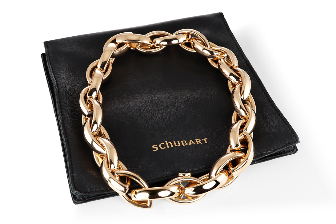 Dieses Collier besticht durch seine eindrucksvolle Präsenz und die hochwertige Ausführung aus edlem 750er Gelbgold. Das Schmuckstück aus dem Hause Schubart vereint klassische Goldschmiedekunst mit einer markanten und zugleich eleganten Gestaltung. Mit einem Gesamtgewicht von etwa 179,0 Gramm vermittelt das Collier eine außergewöhnliche Substanz und unterstreicht seine exklusive Wertigkeit.