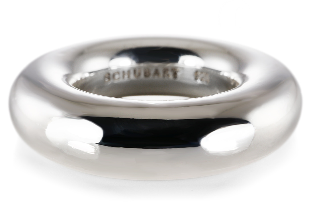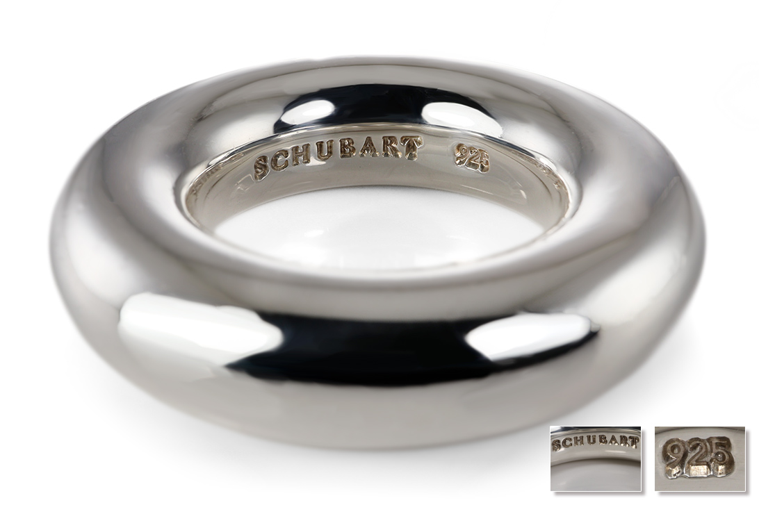 Die Ringschiene misst ca. 7,8 mm in der Breite bei einer Stärke von ca. 7,7 mm und präsentiert sich in einer kompakten, harmonisch proportionierten Ausführung. Die präzise Verarbeitung sowie die charakteristische Linienführung spiegeln die unverkennbare Handschrift von Schubart wider – einer Manufaktur, die für individuelle und ausdrucksstarke Schmuckkreationen bekannt ist. Der kühle, edle Glanz des Sterlingsilbers verleiht dem Ring eine moderne, zugleich zeitlose Ausstrahlung.